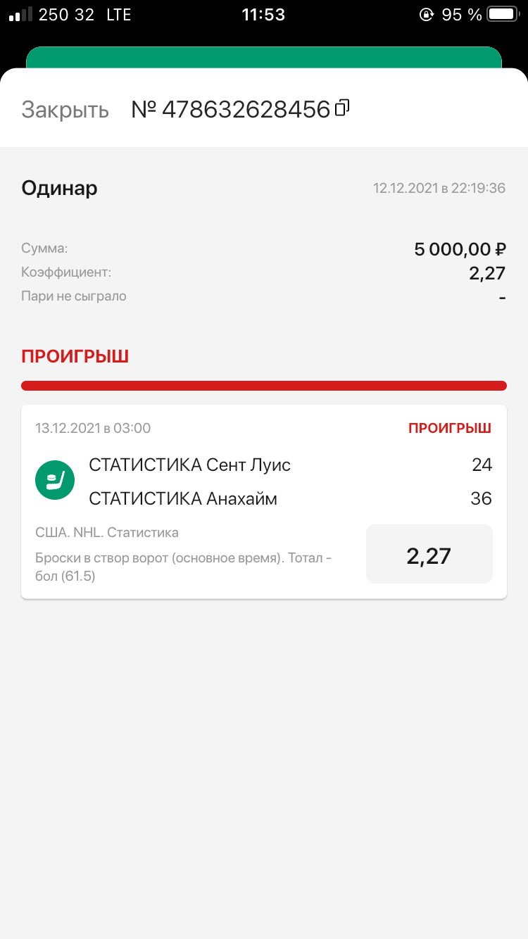 Здравствуйте, я хочу поинтересоваться почему пари на вашей конторе рассчитано не верно? На всех источниках расчет был совершенно другим. Я поставил ставку вчера Сент - Луис - Анахайм на тотал бросков в створ больше 61.5( номер купона 3556 ) Расчет везде был 25:39 и ставка должна выиграть, а вы рассчитали 24:36 и ставка проиграла, как вернуть мои деньги и мой выигрыш????