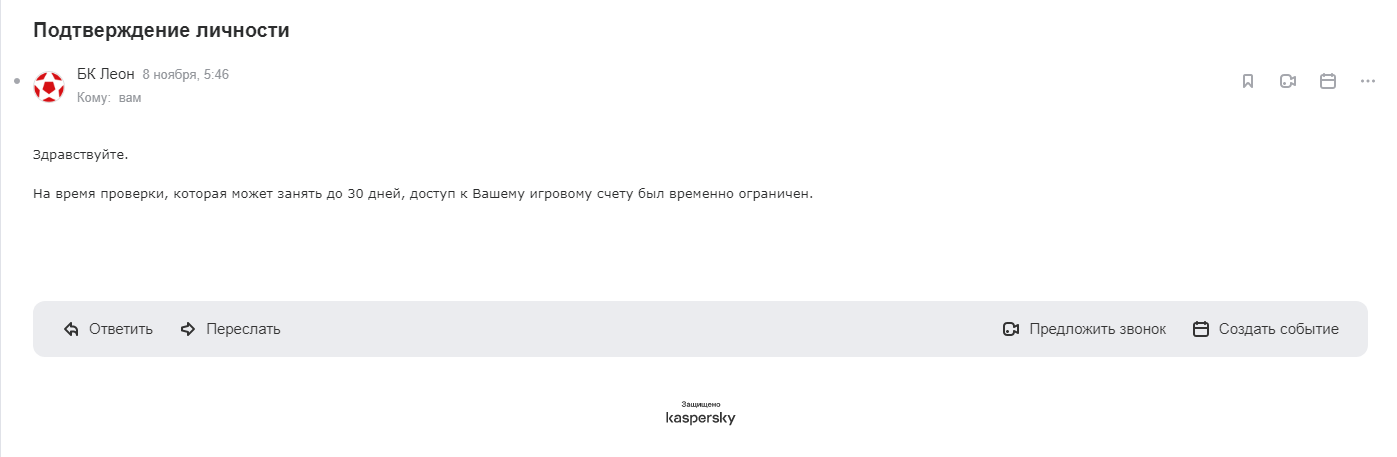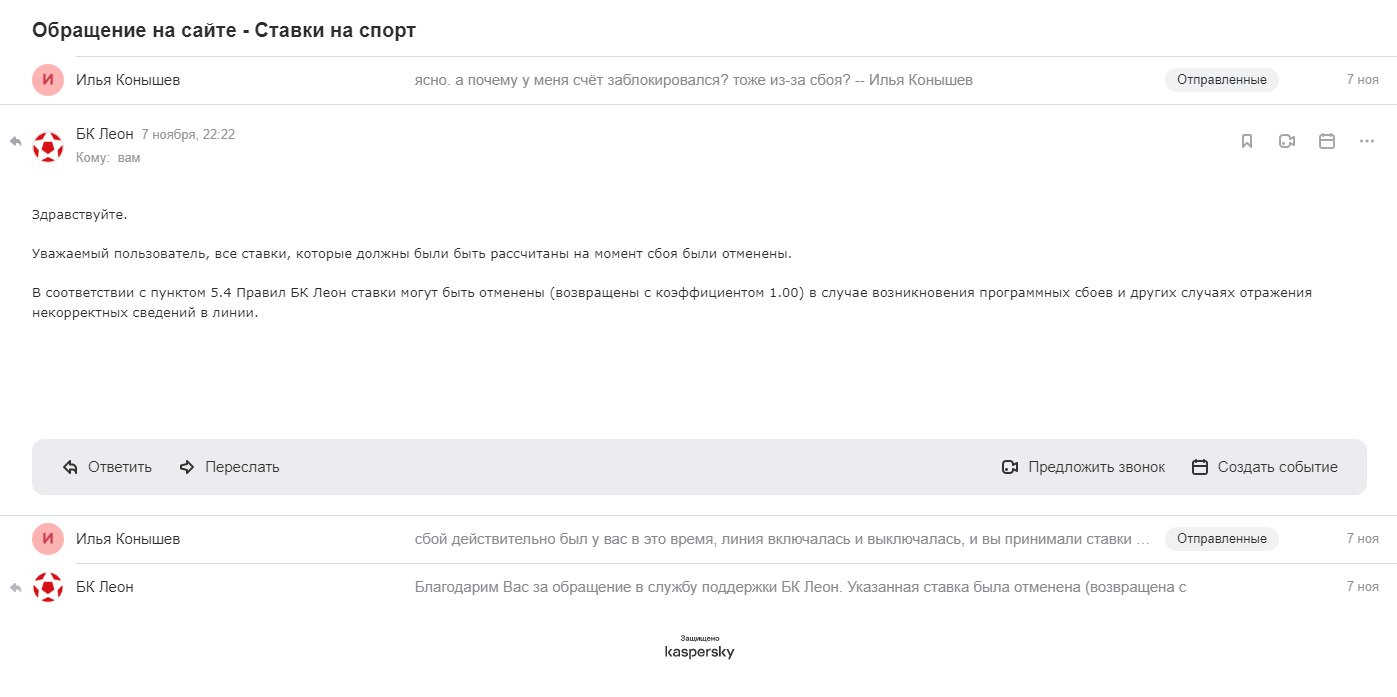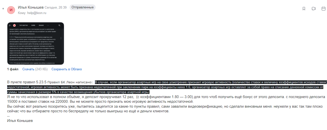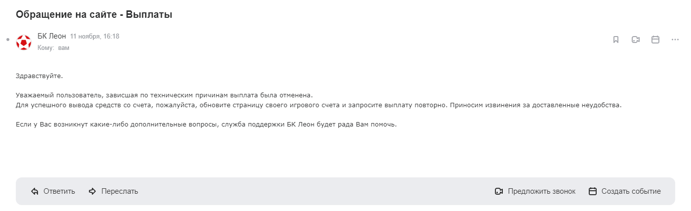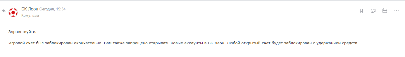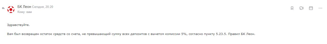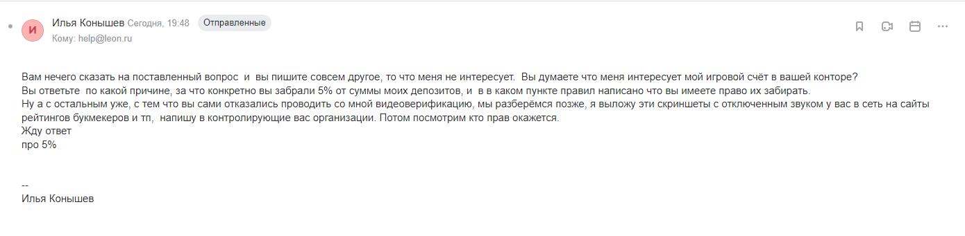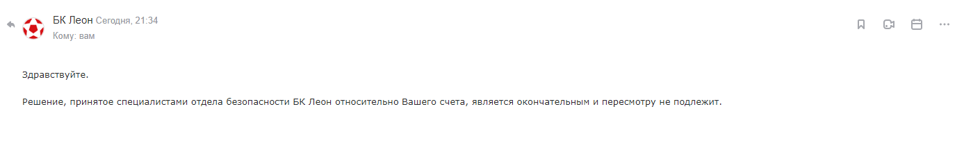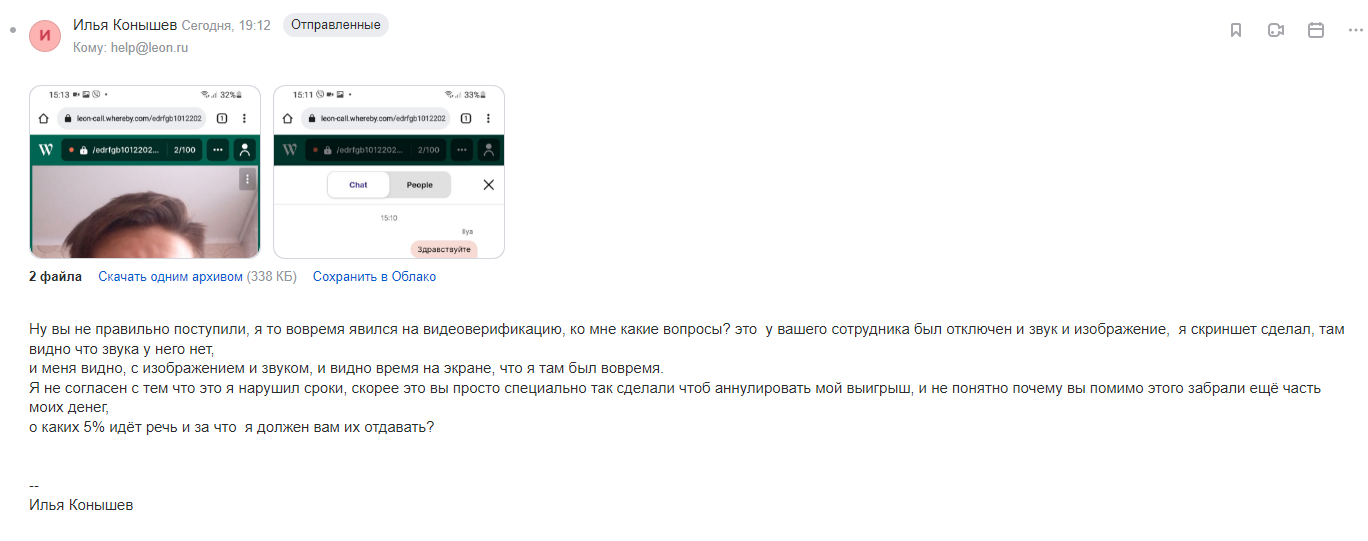 Номер счёта 65159467 Украли деньги 30 тысяч, и ещё сделали возврат выигрышной ставки, тогда бы украли 40 тысяч. Такая вот контора Бк Леон. Зарегистрировался летом, с самого начала ушел в минус, долго отыгрывался, но как только зашел в небольшой плюс у меня сразу выигрыш списали, и часть ещё моих средств. Началось всё с одного матча, Оттава-Тампа, НХЛ, при счёте 2:2 в перерыве после второго периода я поставил 7000 рублей на победу Тампы в основное время, кэф был после того как ставка сыграла мне рассчитали её возвратом и сказали что на сайте был технический сбой, и все ставки сделанные в этот момент подлежат возврату. Это было 7 ноября, на следующий день 8 ноября они заблокировали мне счёт, написали что будут проверять его 30 дней, у меня там был запрос на вывод 14999 рублей, не подтверждённый, 11 ноября они написали что выплата была отменена по техническим причинам, что мне нужно зайти на сайт и запросить её повторно, но на сайт я уже не мог зайти, мой аккаунт был заблокирован, через месяц 11 декабря они написали мне что я должен пройти видеоверификацию, я явился вовремя, но у них был технический сбой и я не видел и не слышал их оператора, в то время как меня было и видно и слышно, я предупредил об этом оператора написал ему в чат. Потом мне на почту пришло письмо что это я нарушил установленные сроки видеоверификации, они забирают мой выигрыш, и ещё 5% от суммы сделанных депозитов, за то что я не достаточно активно играл, их даже не смутило то что с последнего депозита я получил бонус за пополнение счёта по пятницам, а чтоб его получить нужно прокрутить депозит 12 раз. Я сделал скриншеты переписки, и во время видеоверификации я сделал скриншет где видно что у них отключен звук. Такая вот контора у них, не контора, а технический сбой один. Если можно скажите им пусть они вернут мне все деньги которые забрали, и рассчитали ставку на победу Тампы выигрышем.