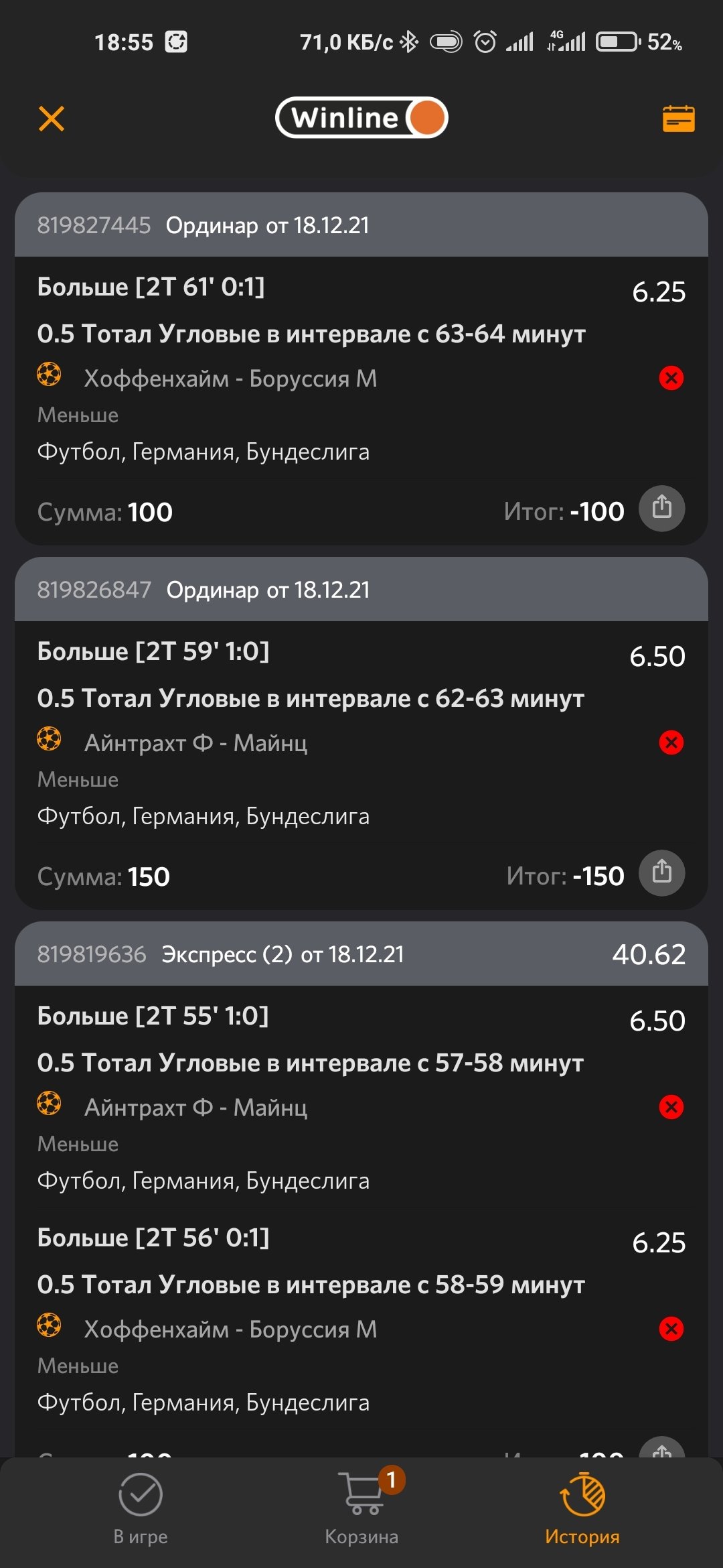 Делал ставки в букмекерской конторе winline на тоталы угловых в интервале минут, уже 3 случая когда ставка не выплачивается при заходе