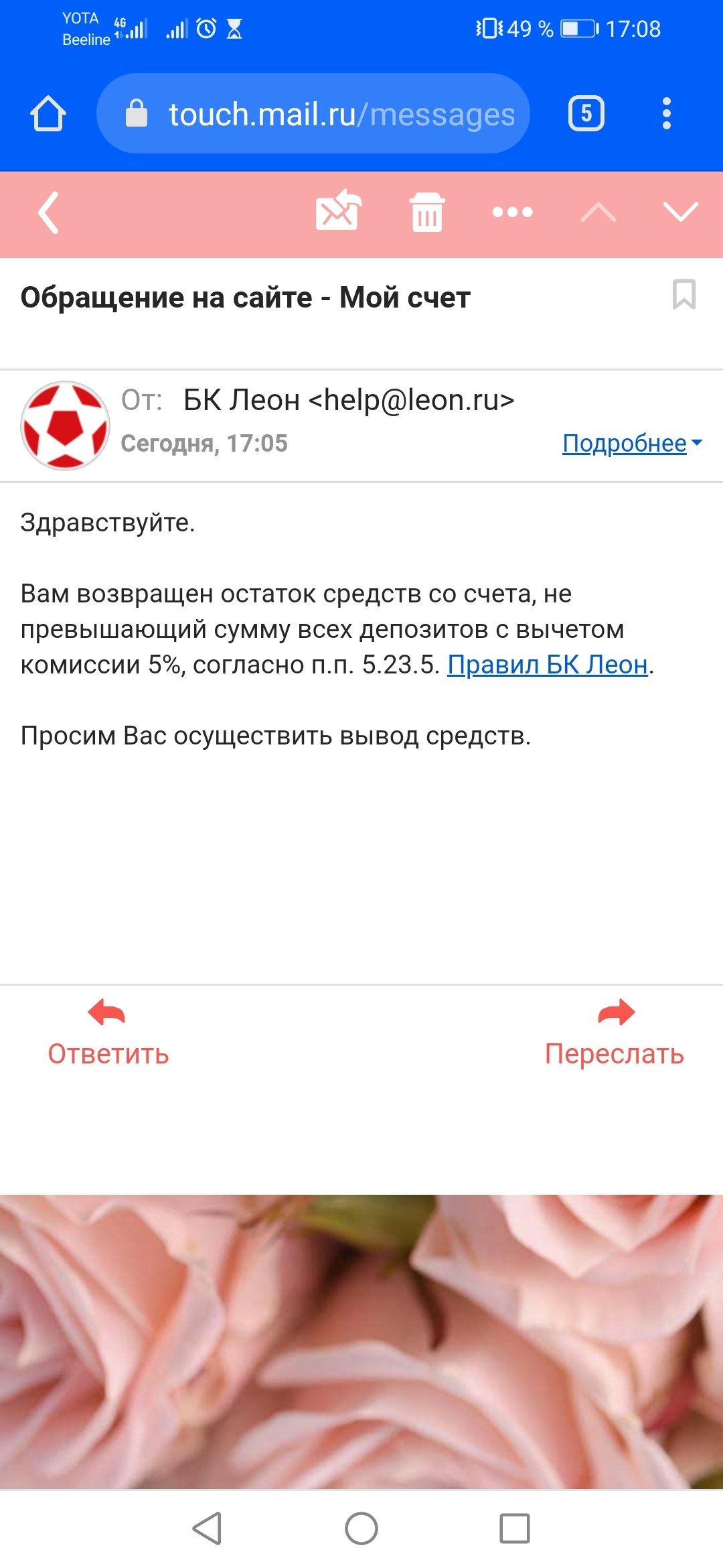 Доброго времени суток, выиграл 45000 рублей поставил их на вывод, в итоге запросили фотку с паспортом и листочком в руке, написали что документы рассмотрены успешно, позвони сотрудник леона, задал пару вопросов на которые я ответил, а далее не слуху от них, пишу им на почту, ответы одни и те же проверка до 30 дней.