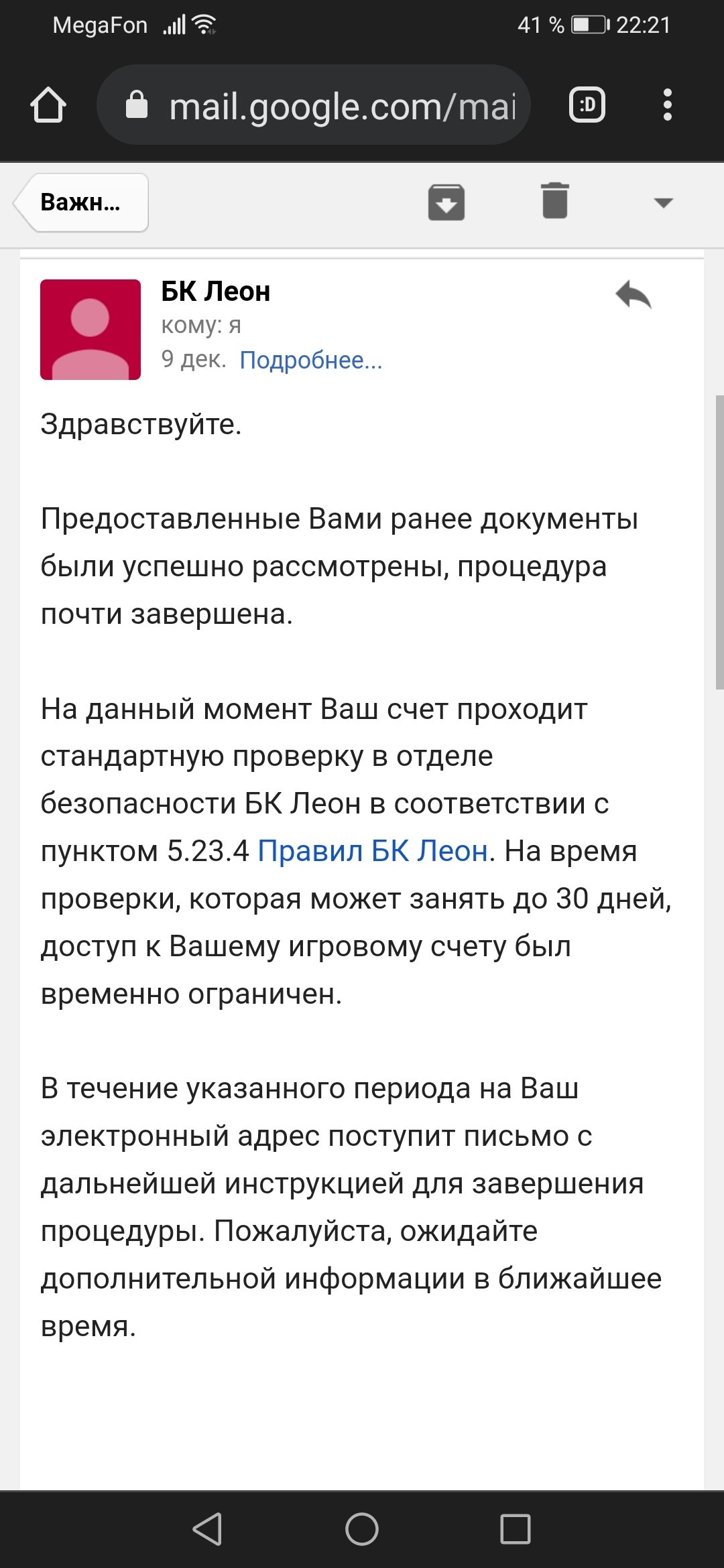 Здравствуйте Legalbet, счёт : 64834375 история такова. Играю на Leone довольно долго, играл без каких либо проблем, сам я обычный лудоман как бы это печально не звучало, даже самоувольнение делал на 6 месяцев. Ближе к теме, перед блокировкой пополнял с кредитной карты с большим лимитом 220к, с начало проигрывал не много, потом пошли суммы по 5-10к после чего начал пополнять ещё и ещё, в итоге на карте денег нет, а проценты идут но да это мои проблемы, вот только последние 3 ставки я выйграл и на счету аккаунта 272к, все доки были предоставлены, правил не нарушал. Прошу помочь LB ускорить проверку.