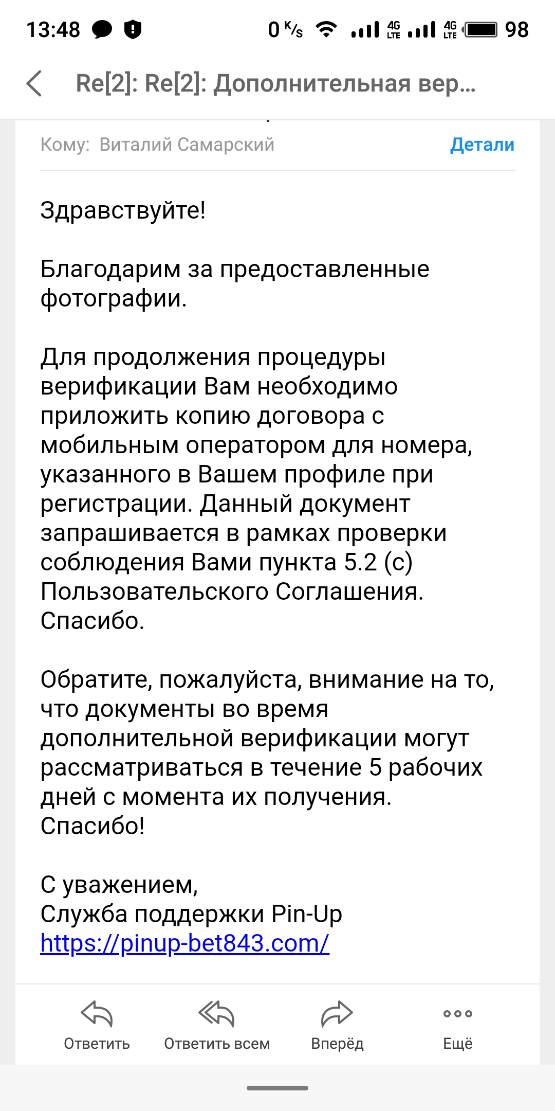 Я зарегистрировался в бк пинап и сразу прошел полную верификацию,профиль полностью подтвержден,до определенного момента все было хорошо все выплачивали,но при последнем выигрыше вывод средств заблокировали,прислали письмо что нужно пройти дополнительную верификацию,попросили скинуть фото Селфи с документом в руках на фоне личного кабинета все сделал отослал,ответили на 6й день, что теперь им надо выписку жкх я отправил им выписку прошло уже 7дней с момента отправки документа жкх никто не отвечает,по отзывам они так и будут тянуть время и запрашивать все больше и больше я устал ждать своих денег пожалуйста помогите решить этот вопрос Дополнительную верификацию они начали 18декабря сейчас уже 30декабря и ничего нет прошло уже 12дней
