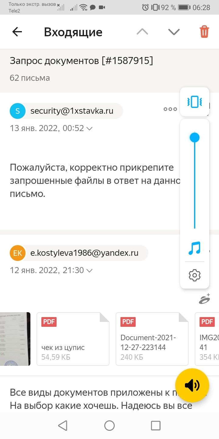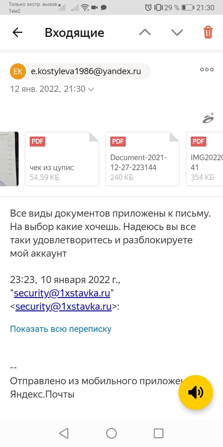 Вот принскрин письма. 4 разных выписки со счета и справок с реквизитами. Также чек о том что перевод сделал с карты в бк 1хставка. А они как пишут - ниодного файла не видят