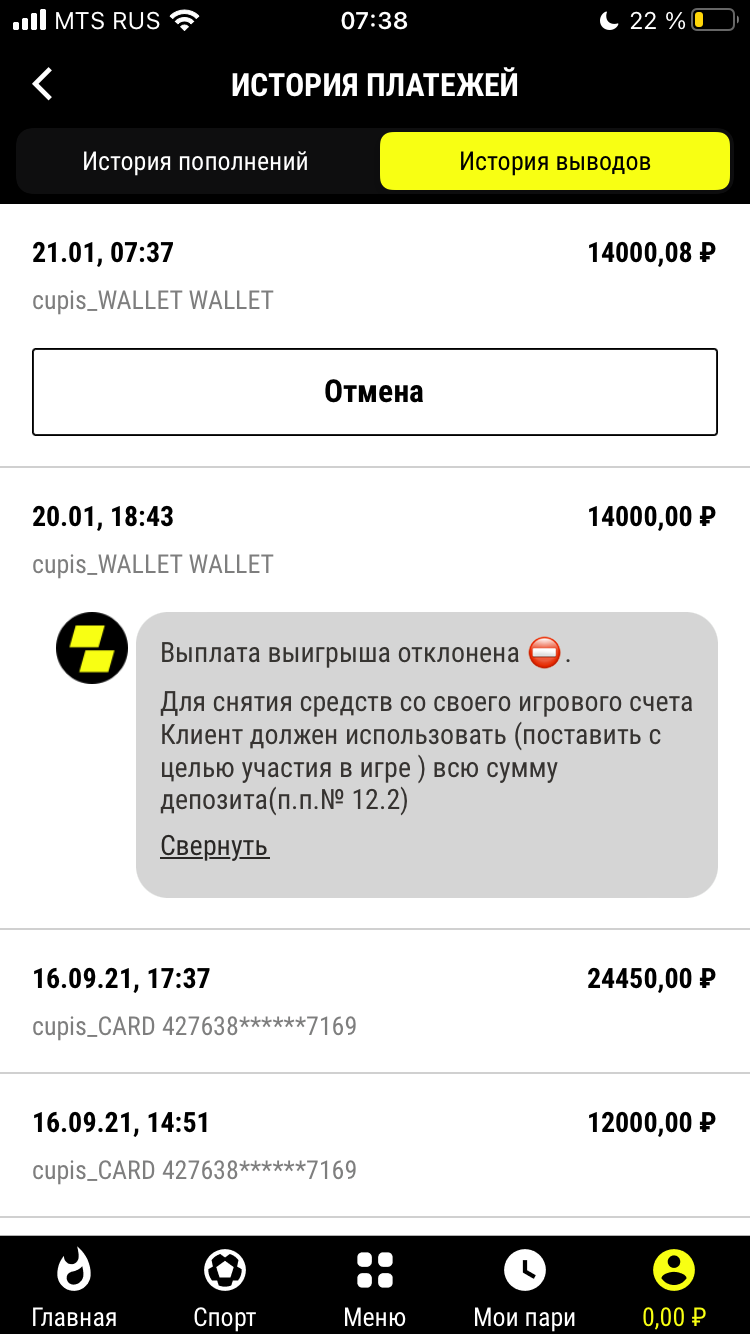 Далее вывод средств мне отклонили, так как надо сначала сделать ставку на сумму депозита.
