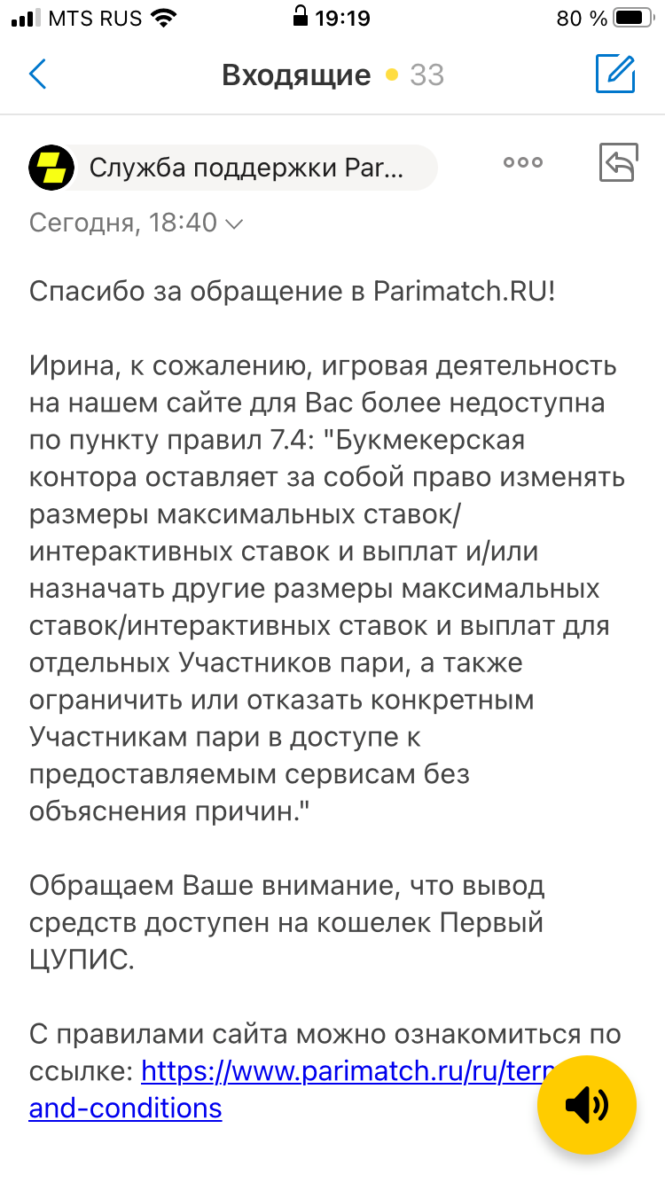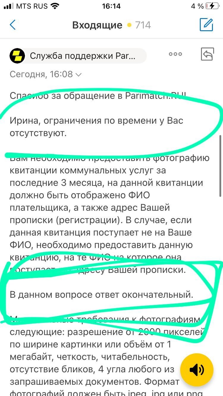 Здравствуйте. 8 декабря я пополнила букмекурскую контору Париматч на рублей. Я не делала ставки, потом захотела вывести деньги обратно и не смогла. Париматч захотел, чтобы я прошла ПОВТОРНУЮ процедуру верификации. Хотя я проходила все верификации до этого и у самой букмекерской конторы и на сайте ЦУПИС, уже присылала всевозможные документы туда, пользовалась этими сервисами уже давно. В париматч я отправила свои фотографии, с данными, которые они запросили. После этого они начали запрашивать ещё кучу разных выписок из банка. Когда я пришла в банк за этими выписками (Сбербанк), то сотрудник банка сказал, что половина из этих данных по закону банка они не могут даже мне предоставить. И что половина данных (которые запрашивает Париматч) по законам банка не передаются третим лицам, это запрещено! Так же в банке мне сказали, что такую информацию запрашивают ТОЛЬКО МОШЕННИКИ, которые воруют данные. Париматч мне не выводит деньги уже ровно 1 месяц. Они не отвечают мне на электронной почте на половину моих запросов, тянут время и т.д. Хотя, повторю, что я даже не ставила ставки и все данные у меня были подтверждены и в самом париматч написано, что статус моего счёта: ВЕРИФИЦИРОВАН. И так же в моем аккаунте написано, что я могу свободно играть, пополнять счёт и выводить деньги. (Прикрепляю скрин)