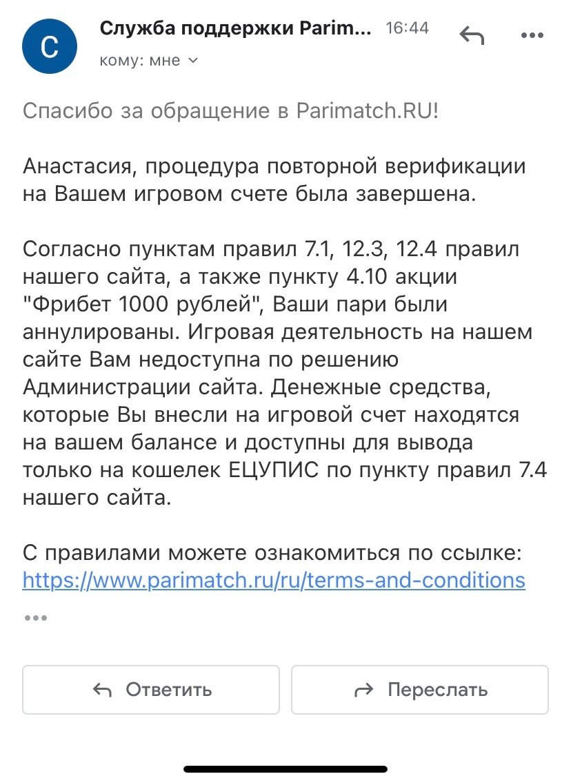НИКОГДА В ЖИЗНИ НЕ СТАВЬТЕ И НЕ СВЯЗЫВАЙТЕСЬ С ПАРИМАТЧ!!!ОНИ Просто МОШЕННИКИ!!!!По-другому их не назовёшь!!!Заблокировали Возможность вывода средств с аккаунта,затем прошла два раза верификацию и теперь они ответили,что аннулировали пари и оставили на счету только средства,которые бы заведены.Было поставлено много пари,из которых несколько стали выигрышными.На счету было 4 с лишним тысячи рублей,они просто взяли и списали выигранные средства со счета,по непонятным причинам!Требую вернуть свои выигранные средства,которые списали необоснованно со счёта!Просто НАЖИВАЮТСЯ НА ЛЮДЯХ!!!Чужие деньги воруют!!!!МОШЕННИКИ САМЫЕ НАСТОЯЩИЕ!!!Извещу всех кого можно,чтобы не ставили и не сотрудничали с данной конторой!!!Привлеку знакомых блогеров,чтобы сделали антирекламу этой конторе!!!Обманщики!!!Или пусть извиняться и возвращают деньги,выигранные честно на мой счёт!!!!Самая ужасная контора и ужасное отношение к клиенту!!!Пусть ждут,репутация у них будет явно подпорчена,пусть только попробуют не вернуть средства на счёт