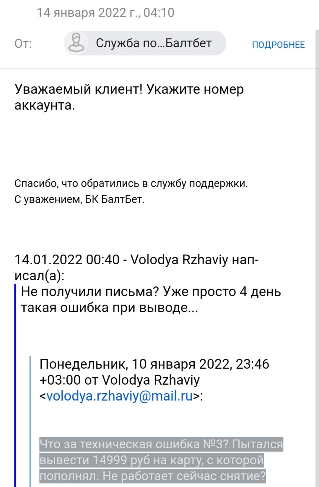 Добрый вечер, пользователи и представители сайта legalbet.ru. Совсем недавно увидел матч, решил заключить пари на 10 тыс руб, ставка сыграла и получил на счет 20 тыс руб. Пополнение было с банковской карты, на нее начал выводить 14999 руб. Но что то пошло не так, запрос отменили и затем произошла техническая ошибка 3... Не понимаю, что это и с чем связано данное явление? Просто хотелось уже получить средства как можно раньше.
