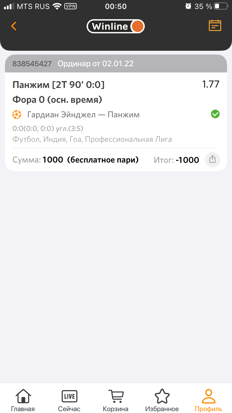 Воспользовался фрибетом 1000р, сделал ставку, игра ещё не началась, и примерно через часов 5-6 пишет итог +0, как это понимать?