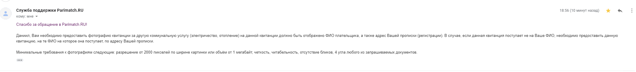 Проблема в следующем: долго не разрешают вывести деньги. Я играю в данной БК около двух месяцев, сам интересуюсь баскетболом. Первый месяц играл, без проблем заводил/выводил деньги, ставил на разные события, в основном тоталы в баскетбольных матчах. Платежная система у меня Qiwi. Но в 20х числах декабря мне запретили выводить деньги и запросили документы, которые я и отправил. На момент запроса документов было около 100 тыс руб.. После запроса документов я продолжаю у них ставить и сейчас там 435 тыс рублей. Неделю назад запросили платежку ЖКХ и фото с паспортом с пропиской — я тоже отправил. Ответа от них пока не получил, но ориентируюсь на 10 дней, как и говорили их консультанты. Но главная проблема: я переживаю, чтобы мне вообще вернули эти деньги. Так как перед Новым годом я заказывал подарки родителям, жене и рассчитывал на те деньги, которые были на балансе в БК Париматч. И когда мне запретили выводить, я, мягко говоря, был очень расстроен и пришлось брать деньги в долг на подарки. Ну и теперь я вот жду деньги, чтобы рассчитаться с долгами. Но чем больше проходит времени, тем больше я волнуюсь, хоть бы отдали. От Вас хотелось бы содействия в выводе денег как можно быстрее. Как я понимаю, Вы можете это проконтролировать и обратиться к букмекеру.