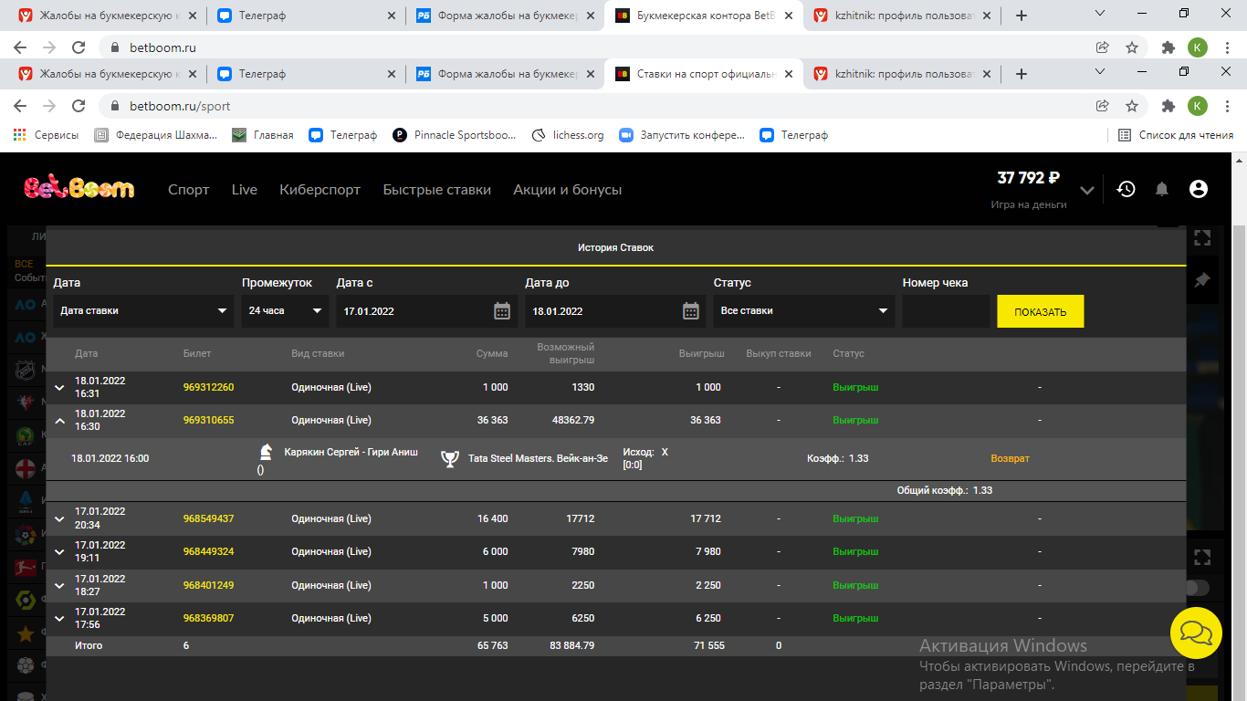 Добрый вечер! Столкнулся с удивительным решением букмекерской компании "Betboom" по расчету моего пари. в 16:30 я заключил пари в разделе "Live" на шахматную партию "Карякин Сергей-Гири Аниш" на турнире Tata Steel Masters-2022, проходящем в Голландии, в Вейк-ан-Зее. Ставка была заключена на ничью, коэффициент . Сумма ставки-36363 рубля. Приблизительно в 16:34 партия была завершена вничью троекратным повторением ходов. Ставка была рассчитана возвратом с коэффициентом 1. Букмекер аргументирует это решение пунктом "Регламента спортивных ставок" букмекерской конторы, который дословно гласит: "Ставки (включая онлайн ставки) считаются подлежащими расчету с коэффициентом 1, независимо от выигрыша или проигрыша ставок, в случае ошибок, совершенных работниками или дефектом программного обеспечения (очевидные ошибки в программе, коэффициенты, итоги, форы, несоответствие коэффициентов в различных позициях, нехарактерные, неправильные коэффициенты и т.д.) и подтверждающих аргументов по поводу неточности ставок." Разговор с специалистом службы поддержки букмекерской компании эффекта не возымел. Имели место 2 разговора, со слов букмекера, первичная и повторная проверка подтвердила некорректность коэффициента. Обращаю внимание на то, что: -коэффициент корректировался экспертом по ходу партии -коэффициент является адекватным для ничейного результата в шахматах в начале партии -все коэффициенты соответствовали данному коэффициенту, т.е не было очевидного перекоса Т.е я нахожу сей коэффициент характерным, правильным, соответствующим коэффициентам из других позиций, очевидных ошибок в программе не нахожу. Когда стало очевидным, что игроки форсируют повторение ходов, коэффициент был заблокирован, что также говорит о пристальном внимании специалиста букмекерской компании к этой партии. Помимо этого, полезно обратить внимание на последний пункт, гласящий: "и подтверждающих аргументов по поводу неточности ставок". То есть, букмекерская компания должна предоставить подтверждающие аргументы. 2 специалиста из службы поддержки такие аргументы дать отказались. Один ответил повторением того, что ставка была выставлена в некорректный коэффициент, второй прямо заявил: "Мы не комментируем данную информацию", что является прямым нарушением пункта правил букмекерской конторы. Таким образом, я считаю, что в отношении меня был нарушен регламент спортивных ставок, и считаю, что ставка должна быть рассчитана с имевшимся коэффициентом, не возвратом, а выигрышем. С уважением.