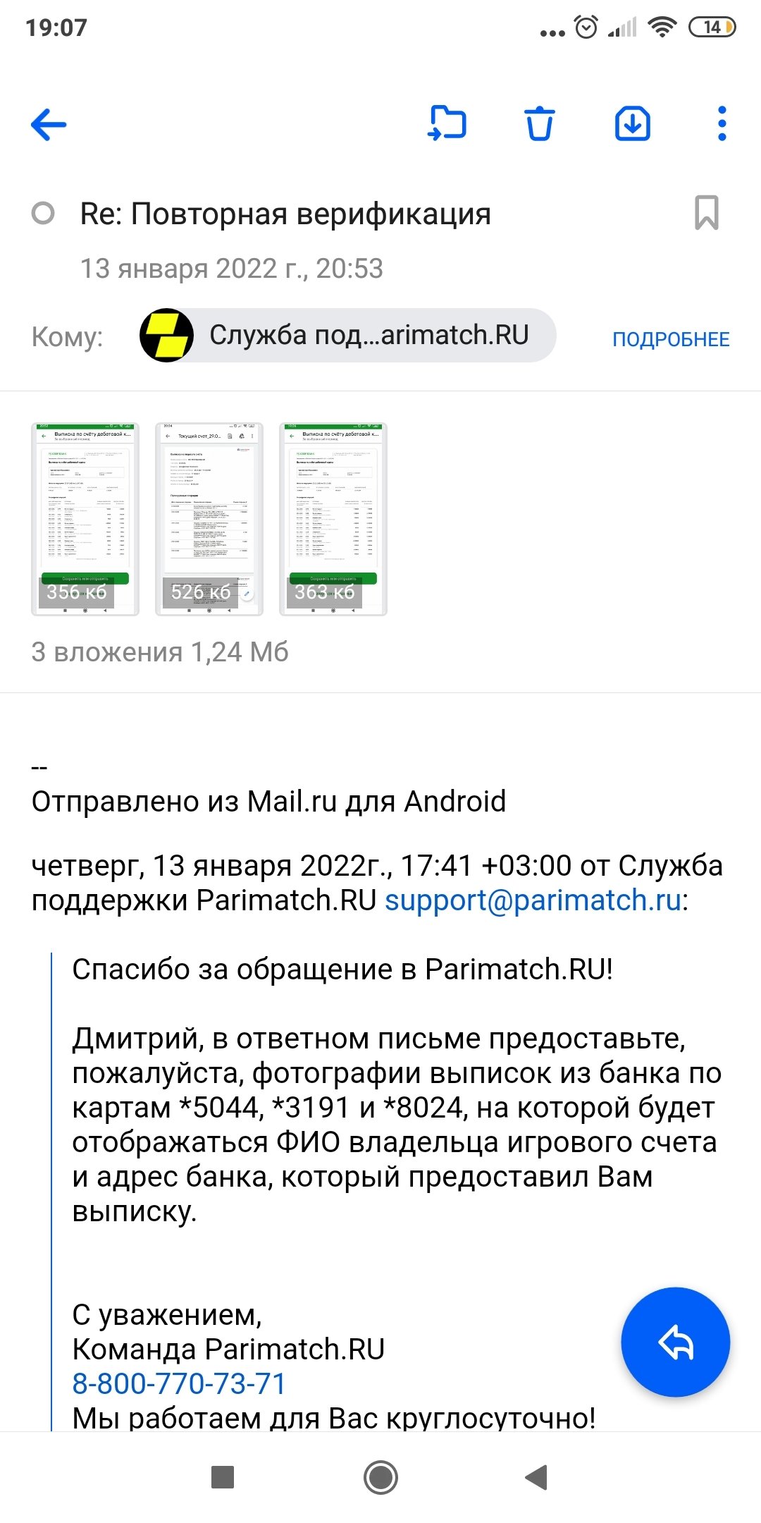 Отправили на повторную верификацию,1 января,я в этот же день прислал фото паспорта с листом ,, для париматч'',6 января отправил фотографию квитанции за коммунальные услуги, а 13 января отправил выписки с банковских карт и до сих пор ответа не последовало, почему так долго