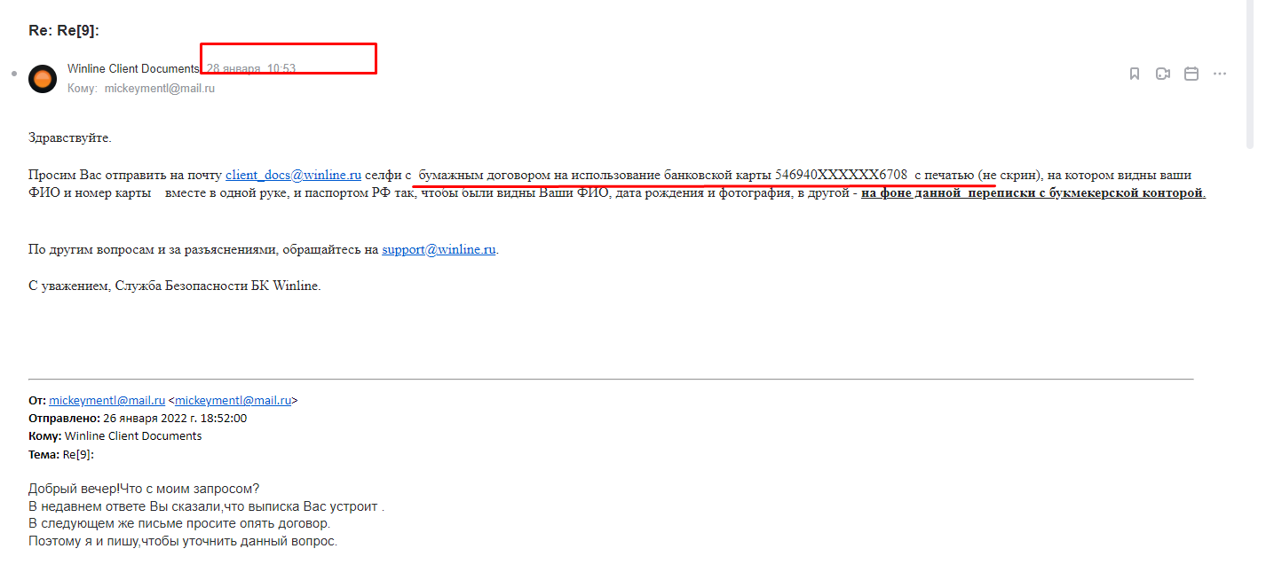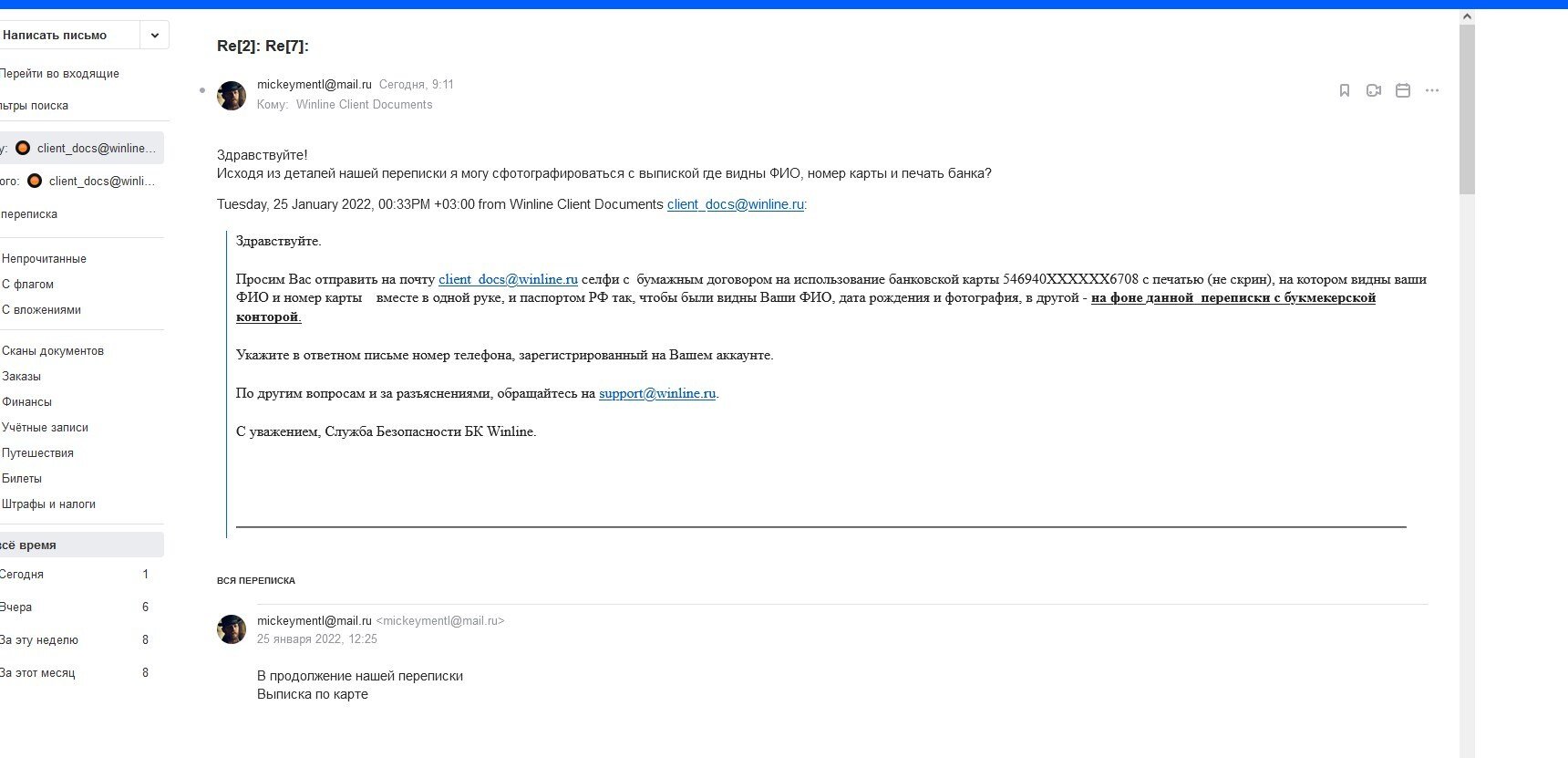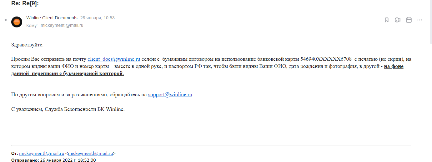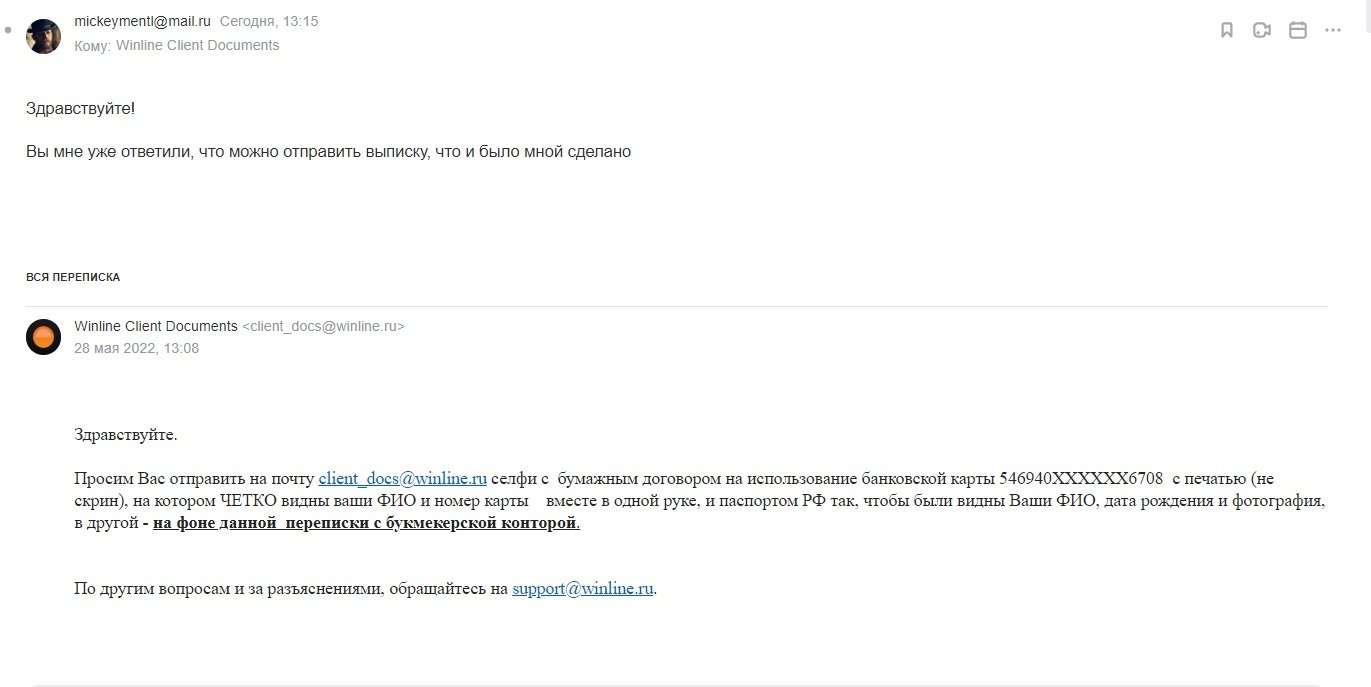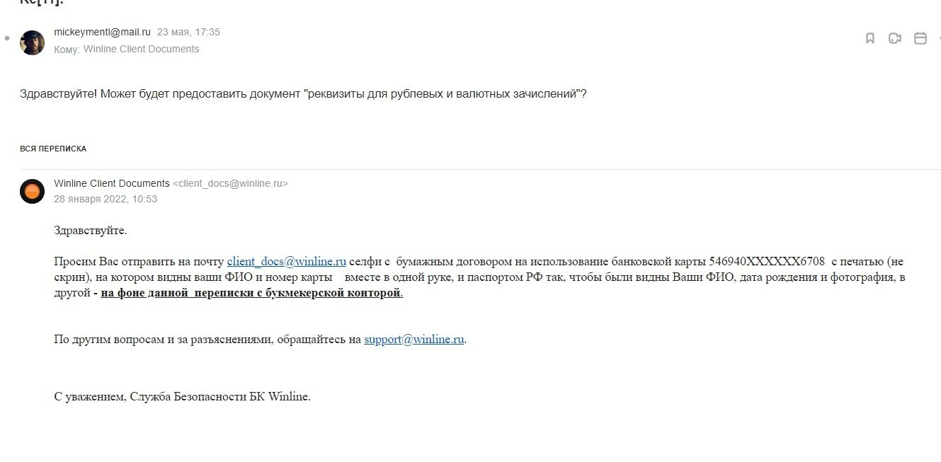 Здравствуйте! 8 января решил вывести часть денег с баланса,создал 2 заявки по 14000тыс. и заодно спросил у поддержки по емайлу почему вывод делается только на банковский счет при указании БИК и Номера счета получателя(хотя до этого можно было вводить и выводить на карту). Ответа от поддержки не последовало!А прошло уже 3 суток.. Далее 11 числа мне приходит на почту сообщение,что букмекер отклонил заявки. Позже решил позвонить по официальному номеру винлайна,где мне было сказано,что деньги выведены не будут до тех пор,пока я не пришлю документы на почту из смс. Я сходил в банк,получил копию договора банковского обслуживания,в котором указан счет получателя,но Винлайн говорит,что этот договор не подходит и требует договор на использование банковской карты,который в Сбербанке попросту не выдают. Надеюсь,что ЛегалБет поможет разобраться в данном споре и мне выплатят мои деньги.Потому что выглядит все так,что Винлайн откладывает это до последнего.
