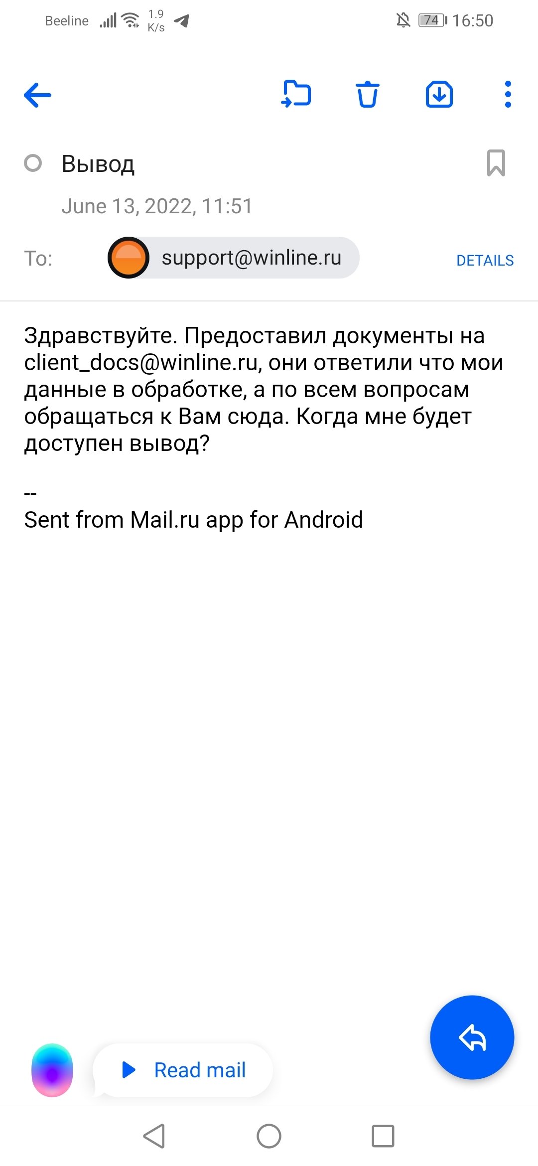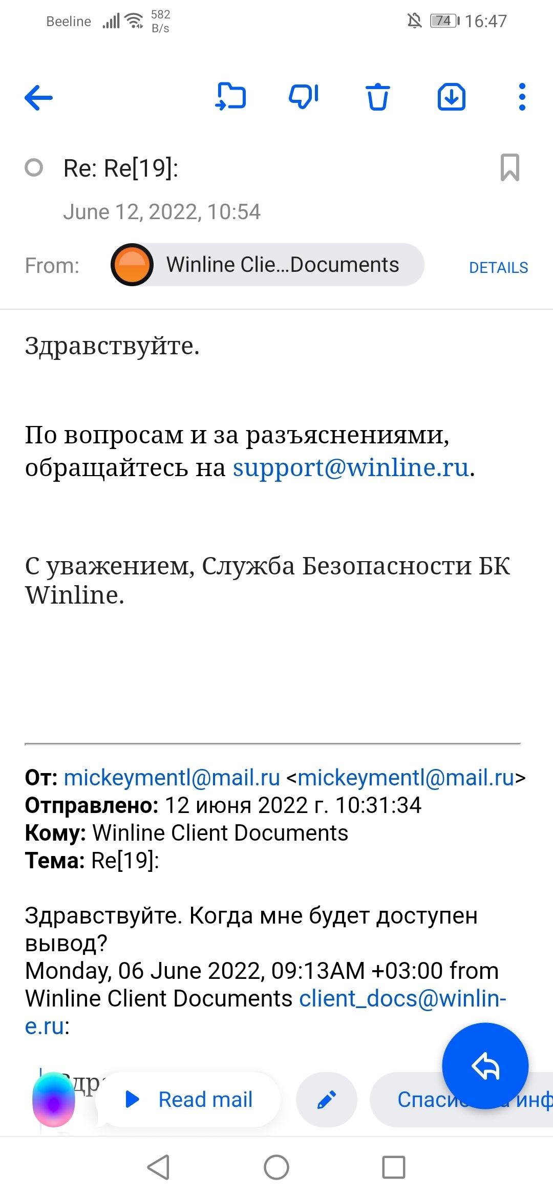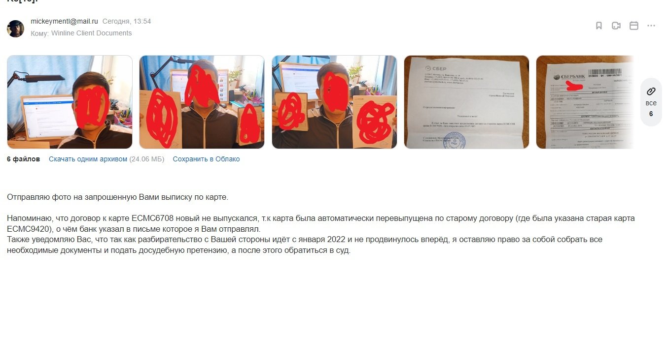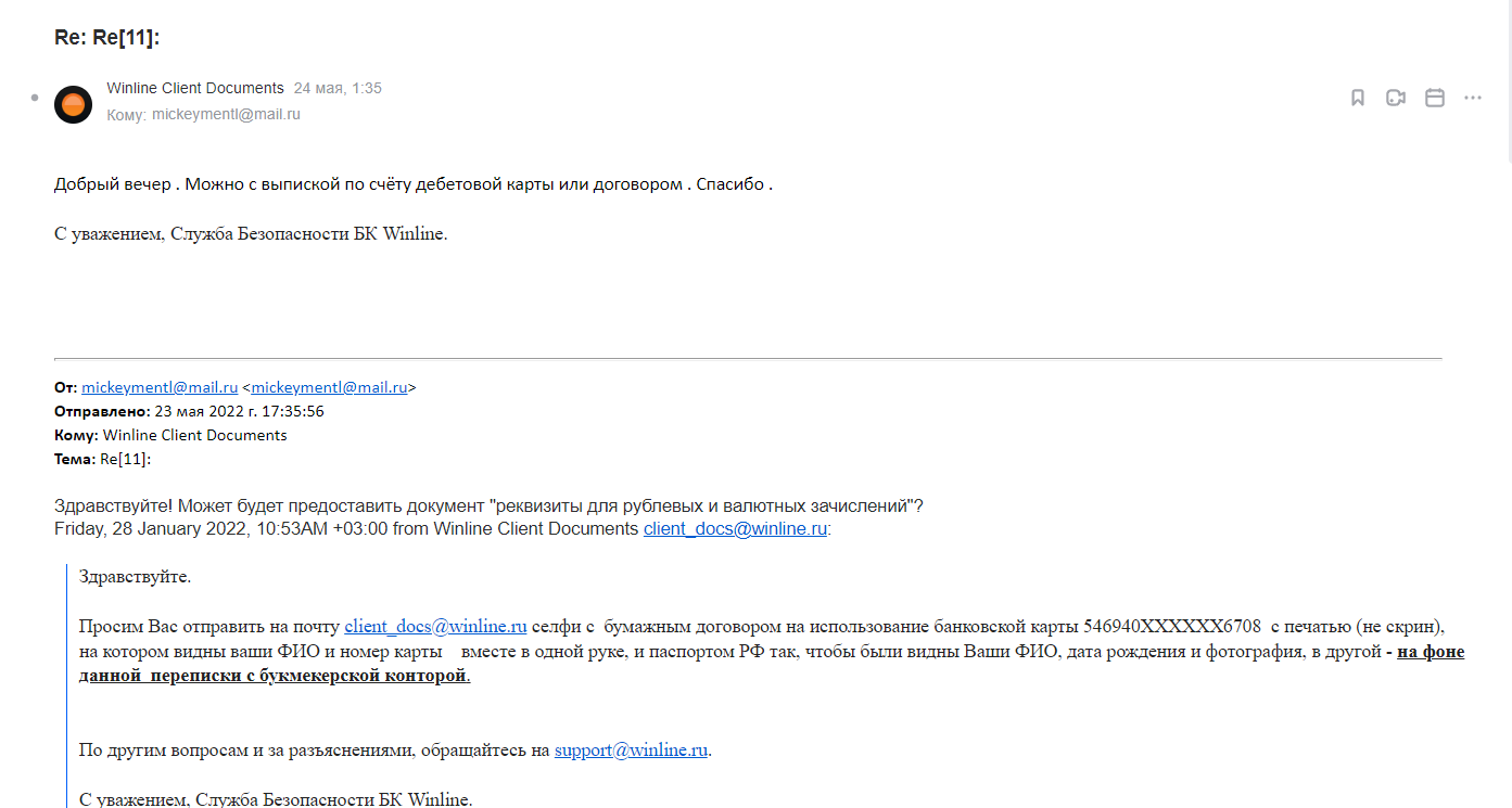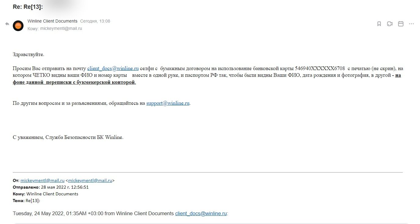 Здравствуйте! 8 января решил вывести часть денег с баланса,создал 2 заявки по 14000тыс. и заодно спросил у поддержки по емайлу почему вывод делается только на банковский счет при указании БИК и Номера счета получателя(хотя до этого можно было вводить и выводить на карту). Ответа от поддержки не последовало!А прошло уже 3 суток.. Далее 11 числа мне приходит на почту сообщение,что букмекер отклонил заявки. Позже решил позвонить по официальному номеру винлайна,где мне было сказано,что деньги выведены не будут до тех пор,пока я не пришлю документы на почту из смс. Я сходил в банк,получил копию договора банковского обслуживания,в котором указан счет получателя,но Винлайн говорит,что этот договор не подходит и требует договор на использование банковской карты,который в Сбербанке попросту не выдают. Надеюсь,что ЛегалБет поможет разобраться в данном споре и мне выплатят мои деньги.Потому что выглядит все так,что Винлайн откладывает это до последнего.