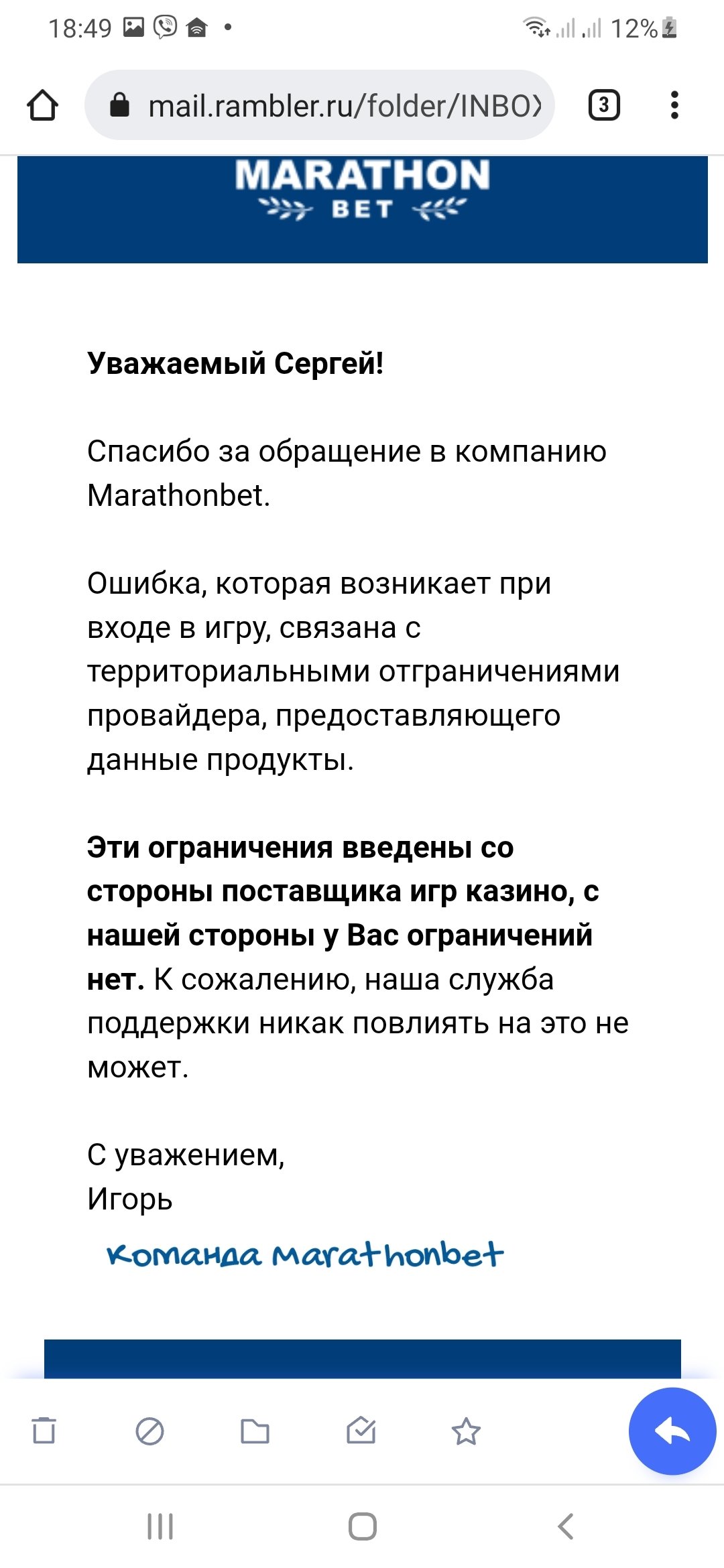 Добрый день. Играю несколько лет, всегда пользовался Марафоном, т.к. считал надежным БК, до этого момента. Играю в онлайн казино от поставщика Evolution В частности в рулетки, и неплохо выигрывал, проигрыши тоже были, конечно, но вопрос не в этом Недавно они пропали из списка, альтернативой предлагается другой поставщик, который мне не интересен. Думал, может день-два и все нормально будет, думал, что проблема у всех, но оказалось - нет. Абсолютно у всех игроков доступ к этому поставщику есть, кроме меня. Писал много раз в техподдержку, ответ всегда один: мы не можем помочь, это блокирует поставщик услуг - Evolution. У меня в аккаунте на всех играх этого поставщика указано, что в моём регионе игра недоступна. При этом человек, стоящий в метре от меня и подключенный к тому же wifi - прекрасно видит все игры и может в них играть. Техподдержка отвечает шаблонно даже не вникая в вопрос: проблема не у нас, блокирует поставщик, мы вам ничего не ограничиваем Предлалают: перезагрузить телефон - делал, почистить кеш/куки - делал, даже пробовал заходить с компа а не телефона - все равно заблокированы игры, а у моих друзей из моего города все работает. Предлагали включить/отключить vpn Делал, заходил с тех же vpn что и мои друзья, менял регион, у них все работает - у меня нет, потому что дело не в регионе а в самом Марафоне. Более того, специально регистрацию прошел в другой бк где есть Evolution - и там у меня тоже все работает, а в моём аккаунте в Марафоне - нет. Писал в техподдержку - врут, что ограничений с их стороны нет. Звонил - аналогично. БК под предлогом придуманного ограничения якобы от Поставщика, не даёт пользоваться услугой которой я пользовался не один год. Все скриншоты прикладываю. На вопросы в каких регионах на их сайте этот поставщик работает - не отвечают. Я пробовал 20 разных стран по vpn, нигде через мой акк не работает Evolution. Прошу придать вопрос огласке, извиниться передо мной и вернуть доступ. В скринах: мой аккаунт изнутри, мой аккаунт в другом бк, где игры работают, ответы техподдержки, скриншот друга у которого все работает и другие.