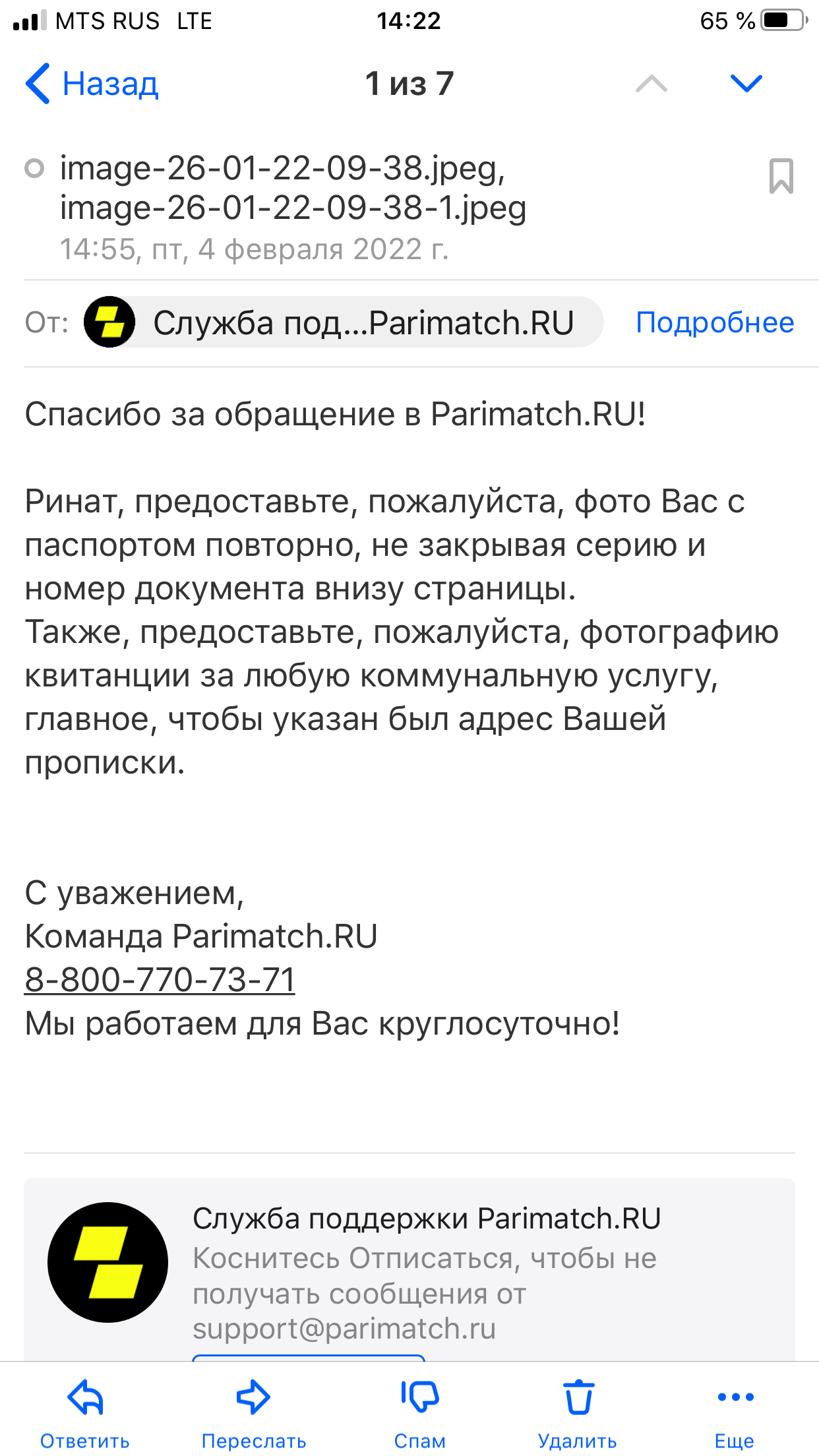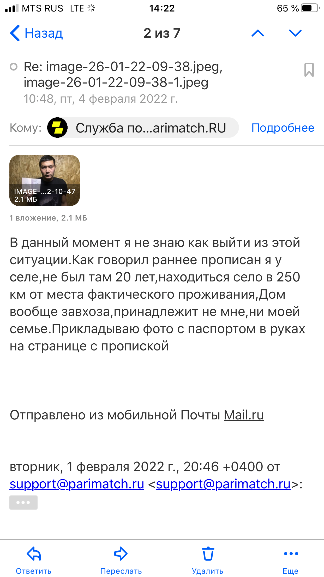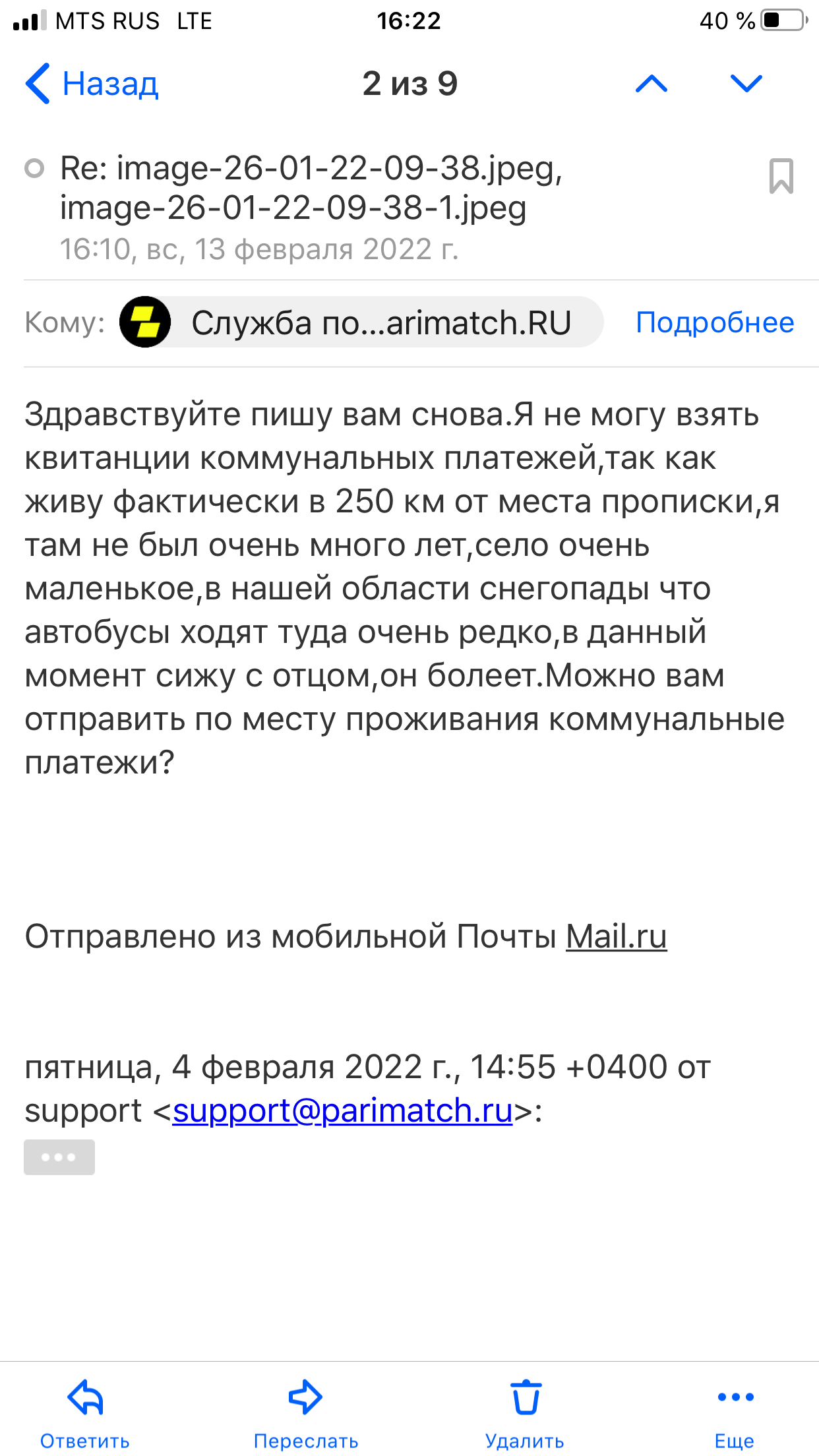 Добрый вечер в Париматч я ставлю достаточно давно, без нареканий были и вводы и выводы, В один прекрасный день попытался подать заявку на вывод, на что мне ответили что нужно связаться со службой поддержки, Попросили пройти повторную верификацию,я отправил все запрошенные фотографии,через несколько дней ответили что нужно фото квитанции ЖКХ по месту прописки, Прописан я в селе в 1992 году,с 1995 года я там не появлялся, село населением пару сотен человек, сейчас наверное и того меньше, находиться в 250 км от места моего фактического проживания, дом скорее всего нежилой ((как мне быть в данной ситуации,готов отправить хоть 20 фото с паспортом и т.д
