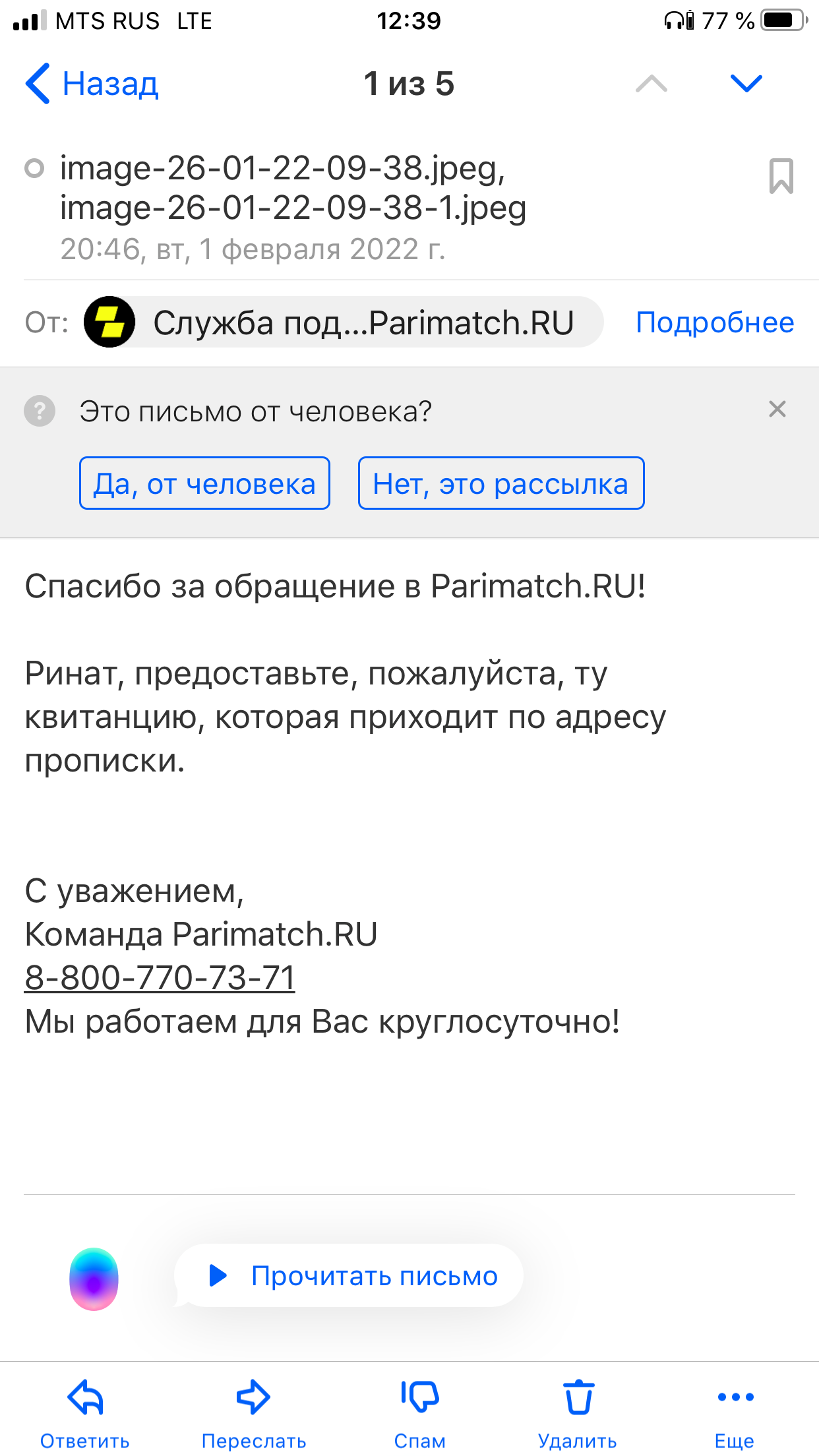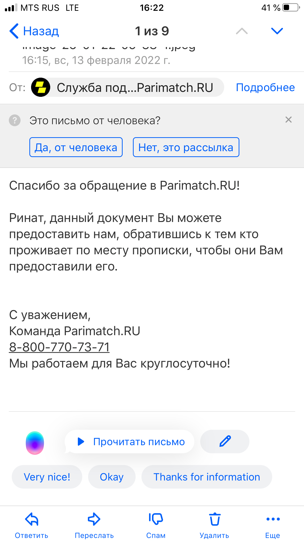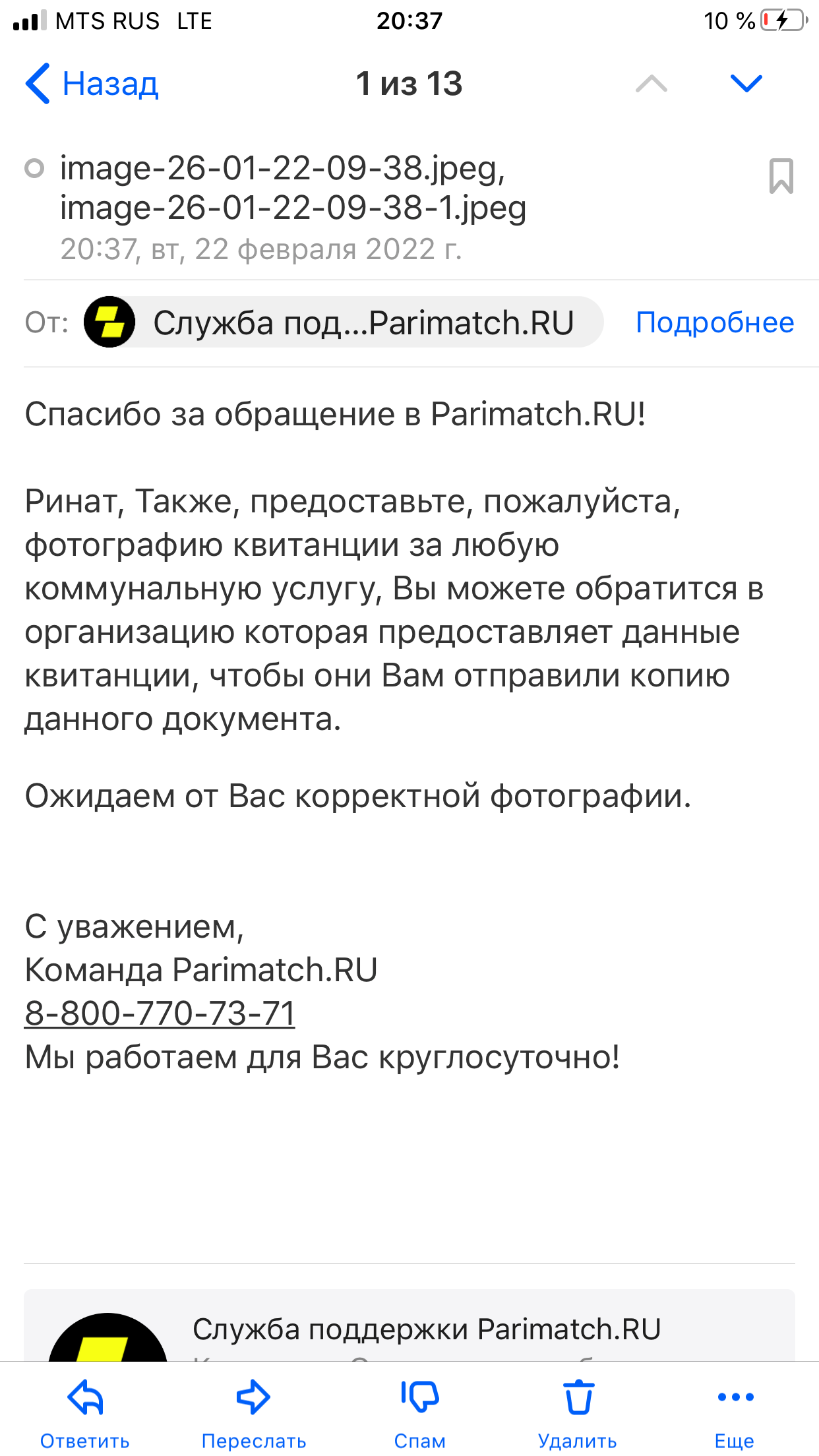 Добрый вечер в Париматч я ставлю достаточно давно, без нареканий были и вводы и выводы, В один прекрасный день попытался подать заявку на вывод, на что мне ответили что нужно связаться со службой поддержки, Попросили пройти повторную верификацию,я отправил все запрошенные фотографии,через несколько дней ответили что нужно фото квитанции ЖКХ по месту прописки, Прописан я в селе в 1992 году,с 1995 года я там не появлялся, село населением пару сотен человек, сейчас наверное и того меньше, находиться в 250 км от места моего фактического проживания, дом скорее всего нежилой ((как мне быть в данной ситуации,готов отправить хоть 20 фото с паспортом и т.д