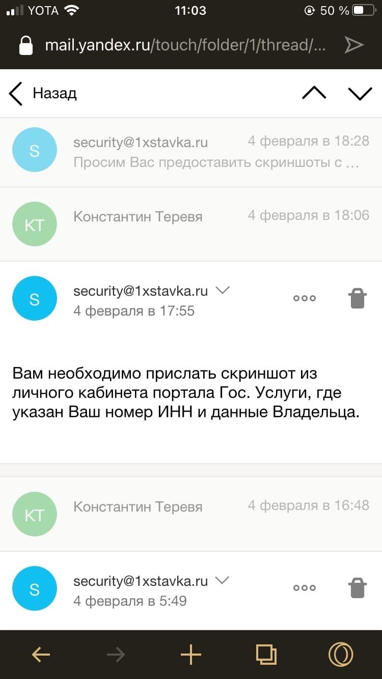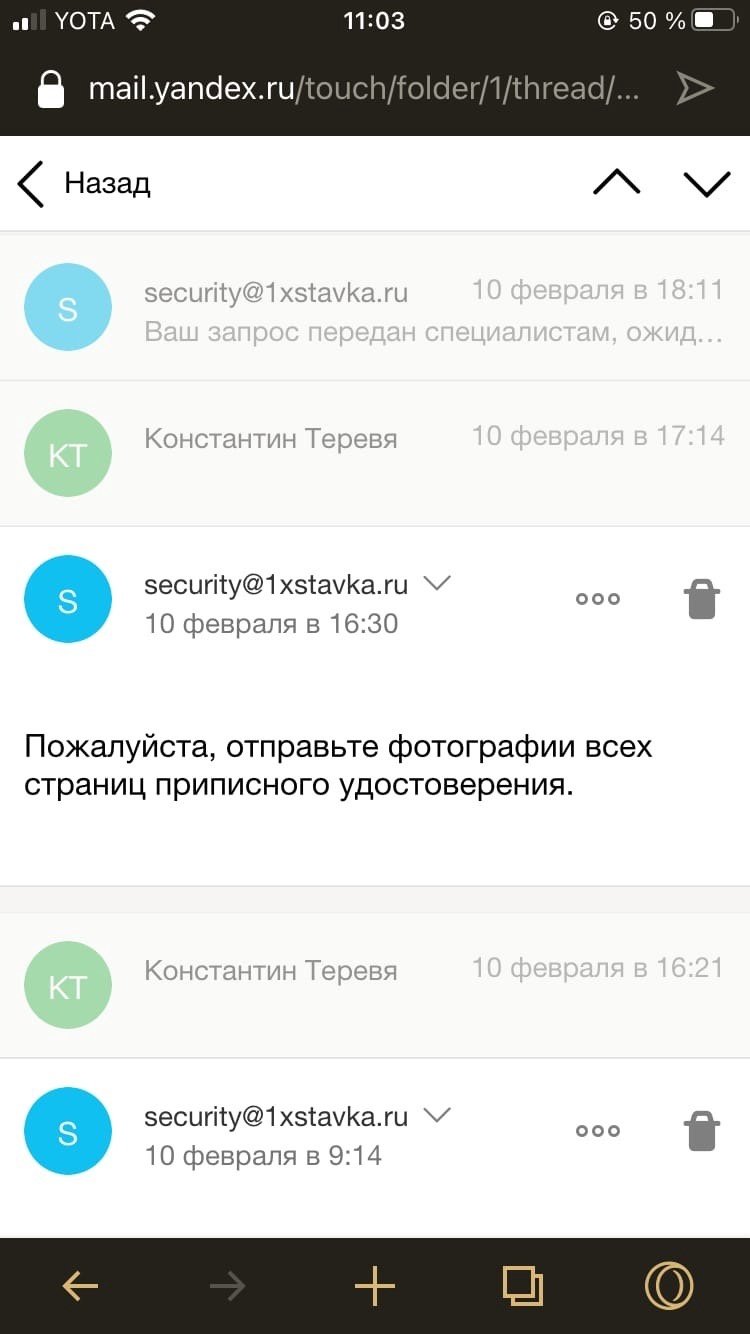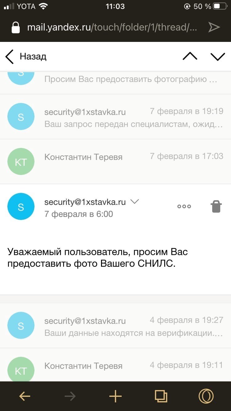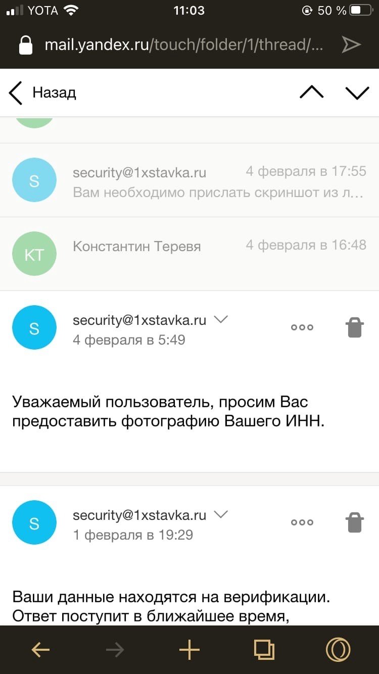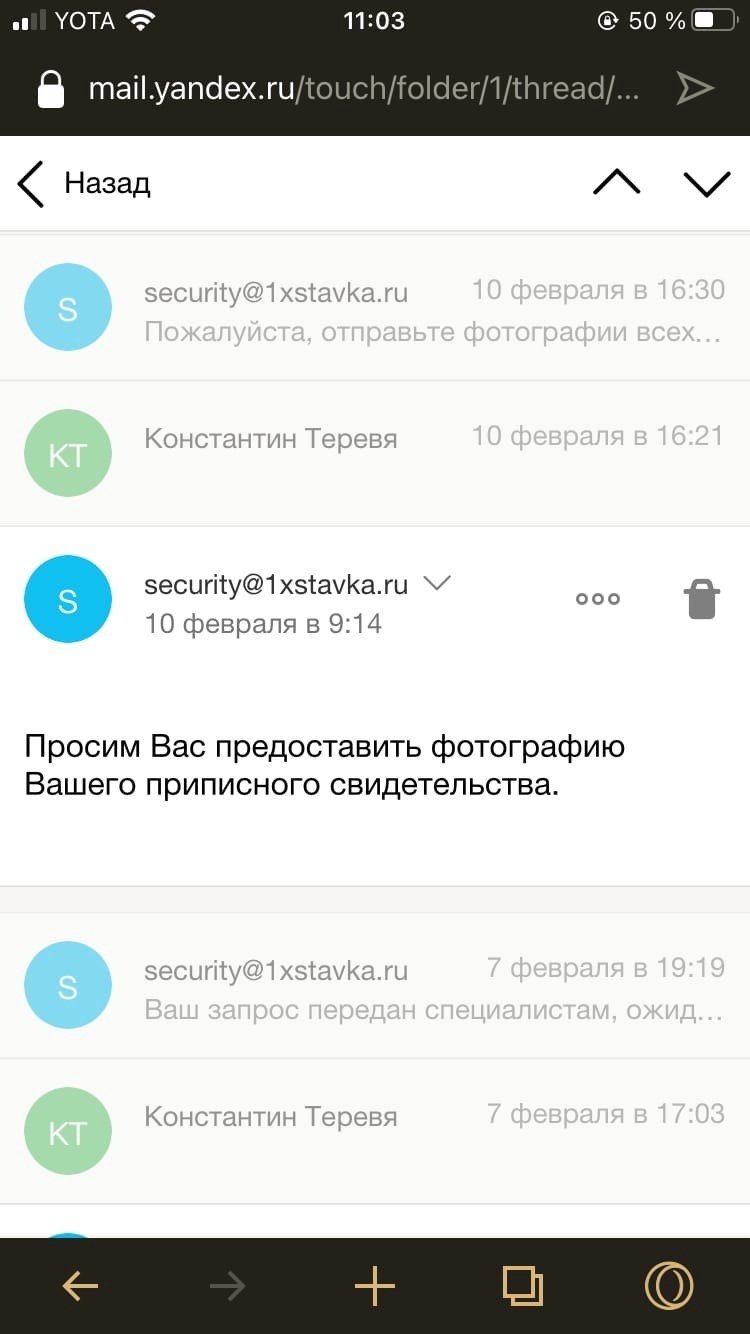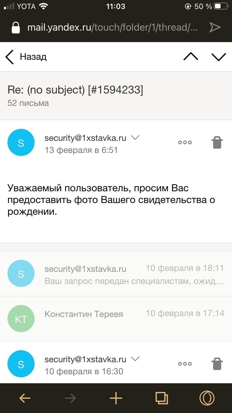Добрый день. Имею проблему с очень долгой верификацией. Началась она месяц назад и идет до сих пор, хотя вроде в правилах букмекера написано до 14 дней. Постоянно просят все новые и новые фотографии, постоянно просят переделывать уже отправленные, по 3-4 раза. Честно, уже надоело, не понимаю сколько это будет еще. К тому же ставить невозможно - дали очень жесткие лимиты. Надеюсь арбитраж хоть немного пошевелит 1ХСтавку, а то это не дело. Просили уже целую пачку документов: Паспорт, прописку, Снилс, ИНН, квитанции, скрин из Гос. Услуг и Налог.ру, военник, сейчас запросили свидетельство о рождении. Уже боюсь что будет дальше) Я все отсылаю, у меня все есть и скрывать нечего. Только после такого отношения со стороны конторы пропадает все желание ставить.