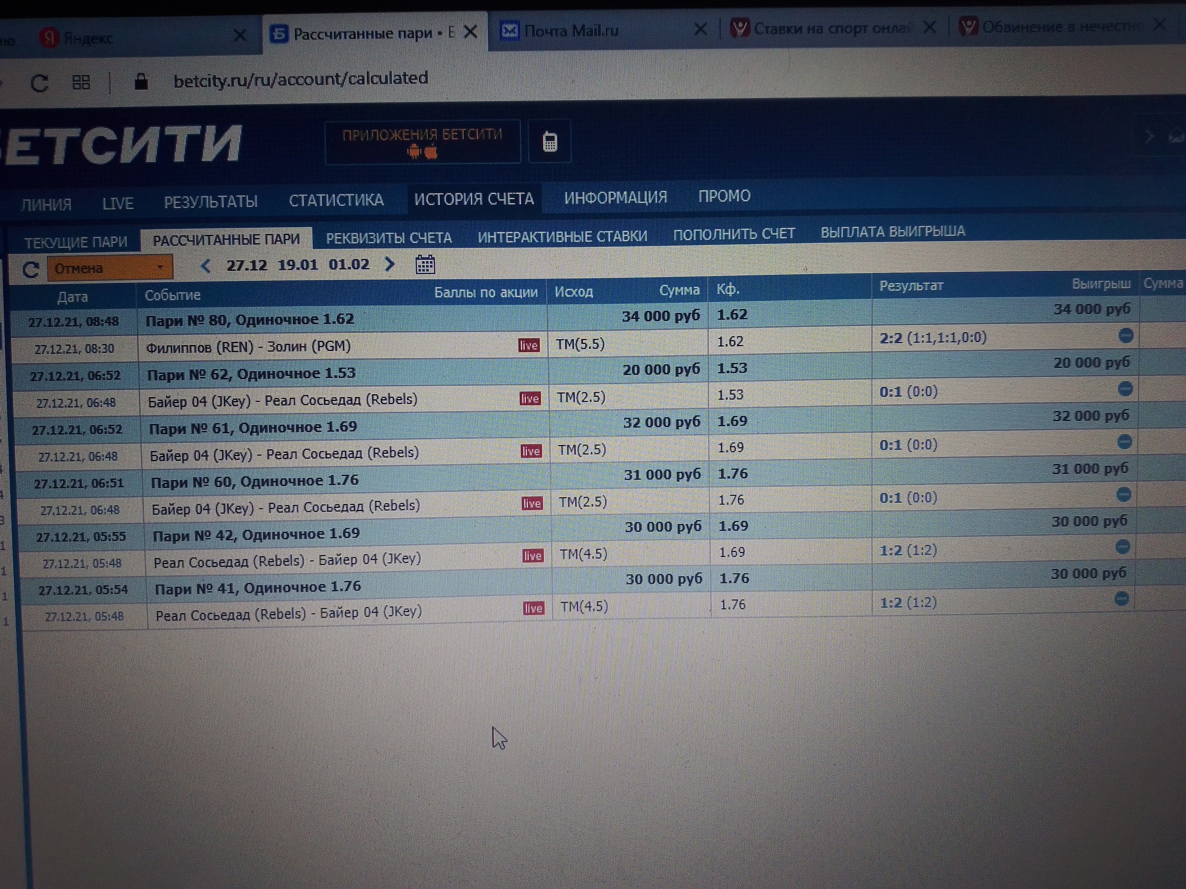 Здравствуйте! Зарегистрировался в букмекерской конторе Бетсити года. Сделал первое пополнение счёта на сумму 20 тыс. рублей. Затем проиграл 20 тыс и сделал ещё 7 пополнений на разные суммы. После очередного пополнения счёта пошла серия выигрышей и я всю ночь делал ставки. Сделал за это время порядка 100 ставок, из которых около 70 % были выигрышными. Средняя ставка была 15-25 тысяч. Ставил в основном на киберспорт и хоккей. В итоге утром у меня на счету было 289 841 рублей. Затем я попытался вывести часть денег, но букмекер отказал в выводе средств и деньги вернулись обратно на счёт Через какое-то время мой счёт просто заблокировали, а дальше был месяц бесконечных переписок со службой поддержки и звонков на горячую линию. Сначала отправил запрашиваемые фотографии, затем мне назначили видеоконференцию. Ждал ее около месяца и в конце января 2022 года мне наконец то назначили видеоконференцию и позвонили по скайпу. Ответил на все вопросы, оператор сказал, что никаких вопросов ко мне нету, все ответил без нареканий. Затем прошло ещё несколько дней и мне разблокировали мой счёт. Захожу на счёт, а там вместо 289 841 реблей осталось 169 021, т.е. более 120 тысяч просто списали со счёта. Посмотрел историю ставок и увидел, что многие выигранные ставки просто перерасчетали с коэффициентом 1, причём все проигранные ставки оставили без изменений, пересчитывали только выигрышные ставки и делали возврат. Суммарно сделали перерасчёт ставок на сумму 177 тысяч. Ни о каких ошибках или неправильных коэффициентах речи даже быть не может, все ставки были сделаны абсолютно честно. Просто букмекеру не понравилось, что я ушёл в плюс и они просто решил не выплачивать мне всю сумму, а выплатить лишь частично и то после месяца нервотрёпок и бесконечных переписок со службой поддержки. Считаю действия букмекерской конторы абсолютно мошенническими, прошу разобраться в данной ситуации и повлиять на Бетсити для урегулирования ситуации и возврата моих денег в досудебном порядке. Буду предпринимать все имеющиеся у меня меры, чтобы предать делу максимальную огласку и привлечь букмекера за мошенничество. Все скриншоты и истории переписок имеются. Номер игрового счёта 13932932