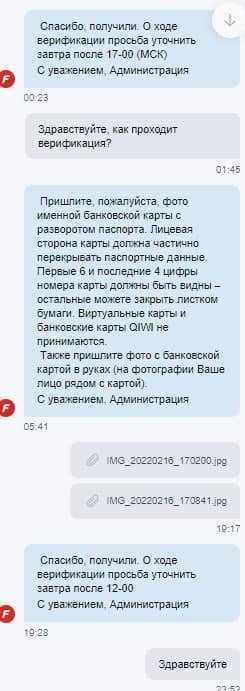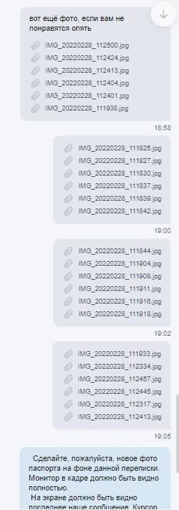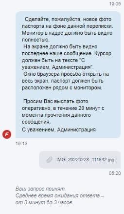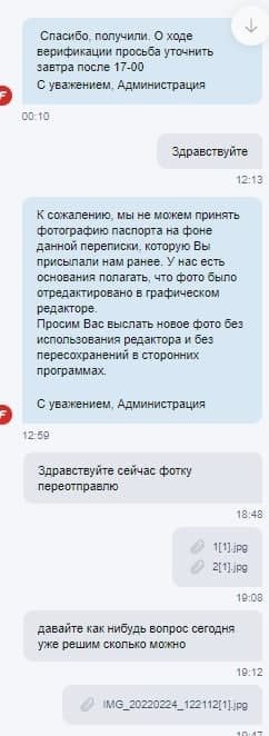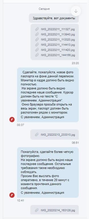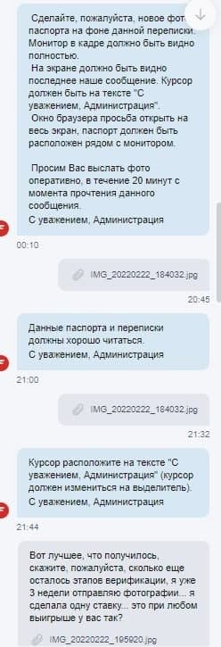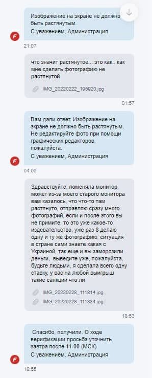 Здравствуйте, не принимают фотографию с монитором и паспортом в фонбете уже 3 недели, уже 10 попыток отклонили, а фотографий отправлено было штук 40 уже, говорили, что это самая лояльная бк и с нее лучше всего начинать, но после единственной выигрышной ставки, у меня запросили фотографии с монитором и паспортом и фотографию именной банковской карты, это ладно, но 10 раз делать одну и ту же фотографию уже какой-то абсурд, прошлым сообщением отправила им сразу 24 фотографии, все равно просят еще...... Это просто издевательство какое-то уже, помогите мне, пожалуйста, решить эту проблему, сумма довольно крупная и весомая для моей семьи, особенно в такое время в нашей стране... Прикрепляю фотографии переписки
