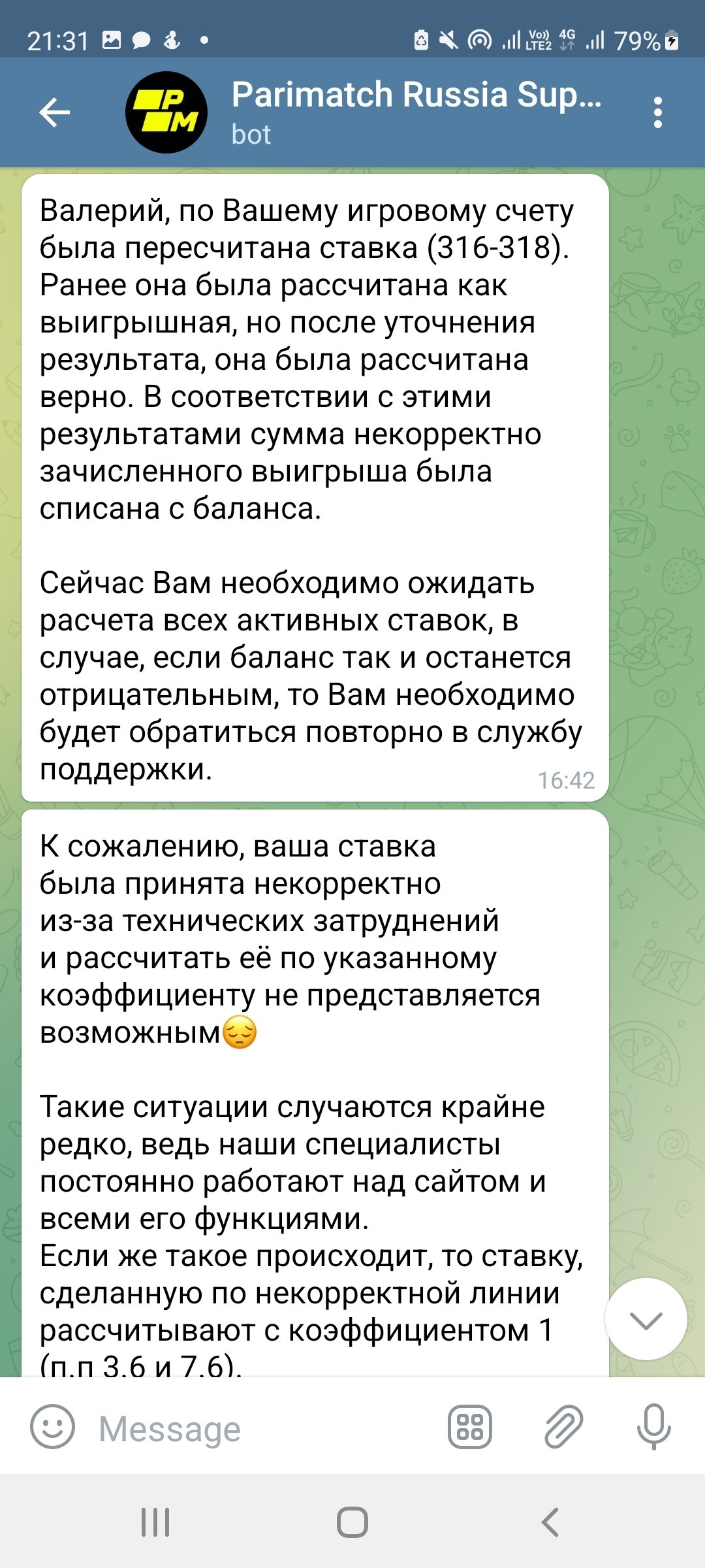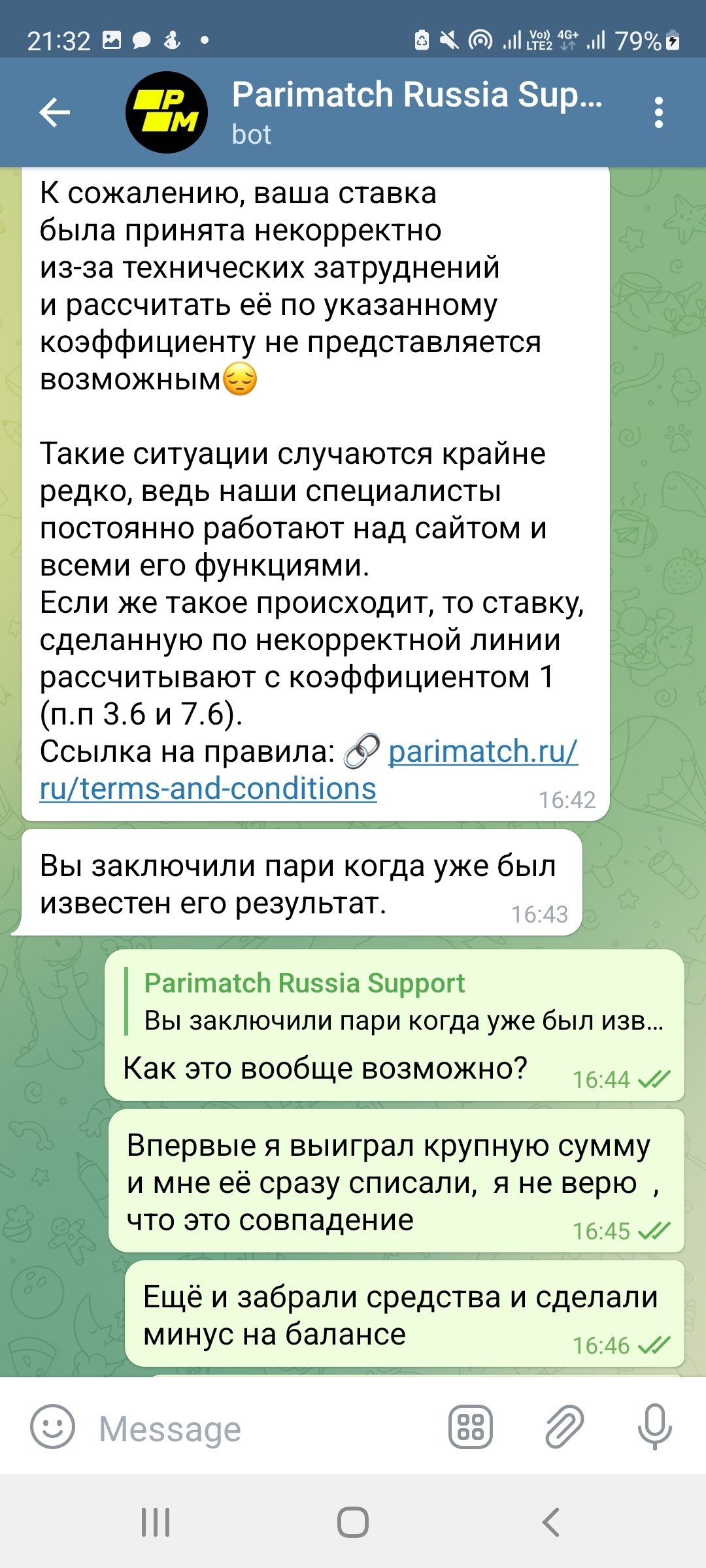Ставил на бк париматч уже около месяца или больше, есть подтверждение цупис, все было хорошо и даже были выплаты. В один момент мне повезло выиграть крупную сумму, был очень рад, выиграл 35000 . Я вывел 19500 успешно и оставил ещё 15000 чтобы дальше ставить, но через время я захожу на аккаунт , а на счёте нет средств и даже минус 5000 !!! Весь мой выигрыш обнулили и даже забрали больше, чтобы я сам пополнял. В тех поддержке объяснили, что такое "иногда" случается, но я не верю, что это совпадение..