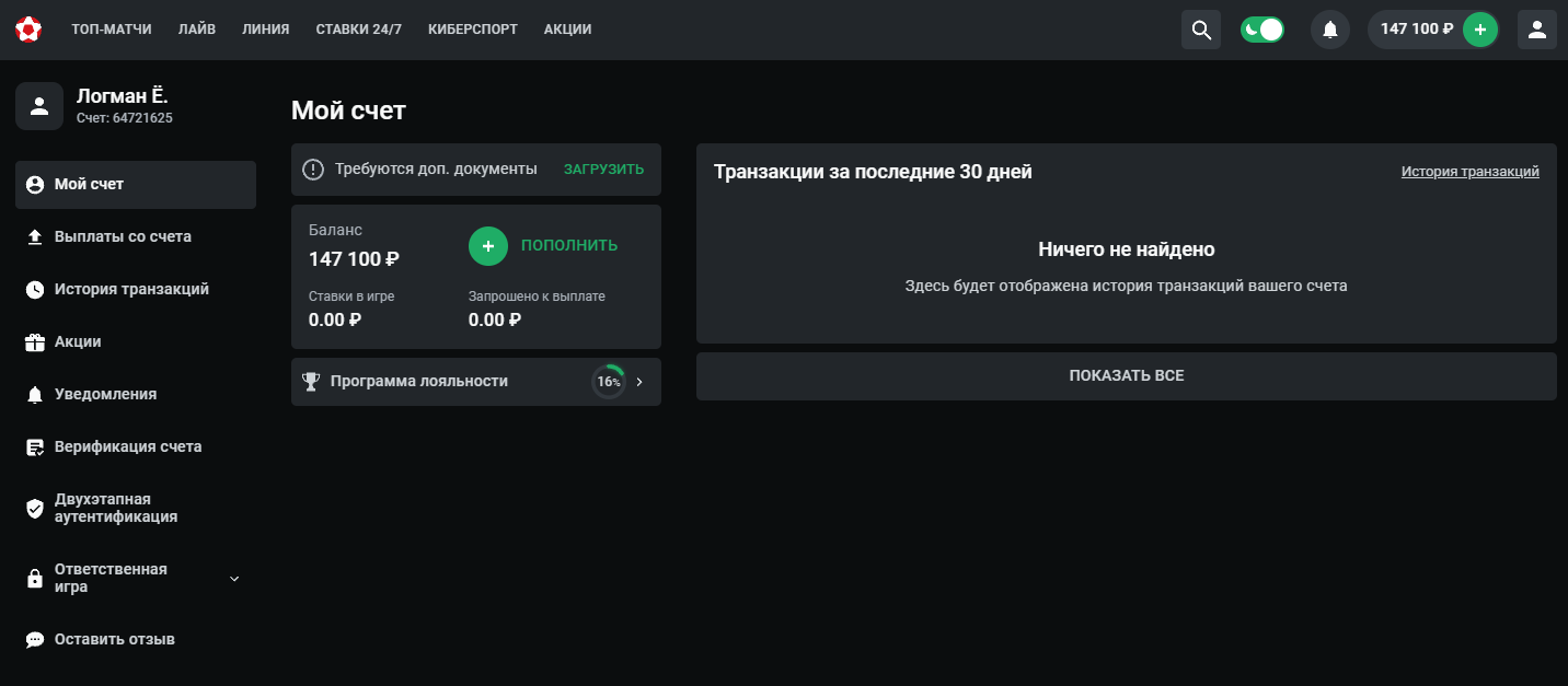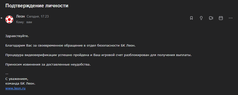 На данный момент Ваш счет проходит стандартную проверку в отделе безопасности БК Леон в соответствии с пунктом 5.23.4 Правил БК Леон.