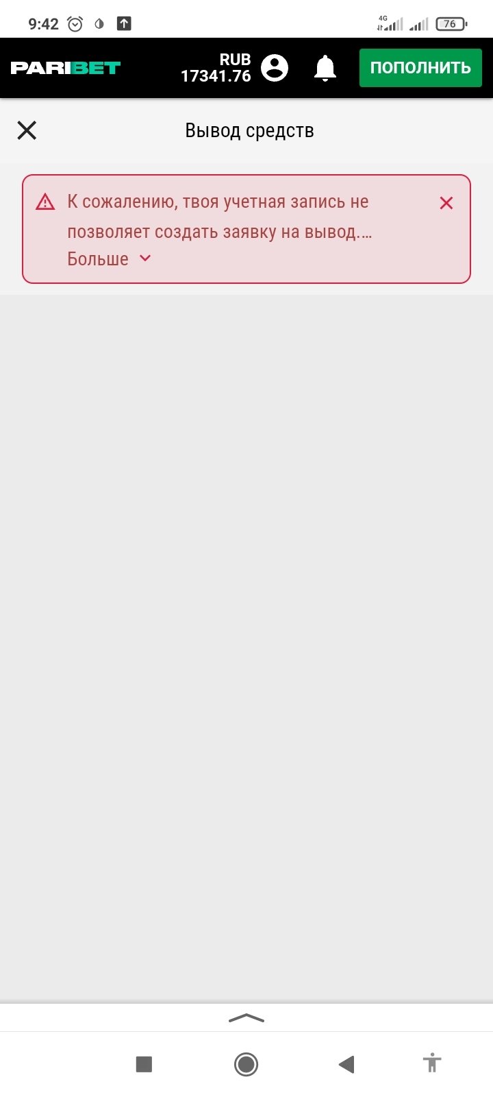 Спасибо легалбет за помощь в решении вопроса. После вывода средств букмекер прислал сообщение что игра на ресурсе заблокирована по п7. 4 правил (без объяснения причин). Связываю это с предыдущей жалобой по ставке на матч Славия Прага-Ласк. Которую букмекер оставил без рассмотрения. Никому не рекомендую связываться с Париматч он же Парибет. Ребрендинг прошёл и начались проблемы.