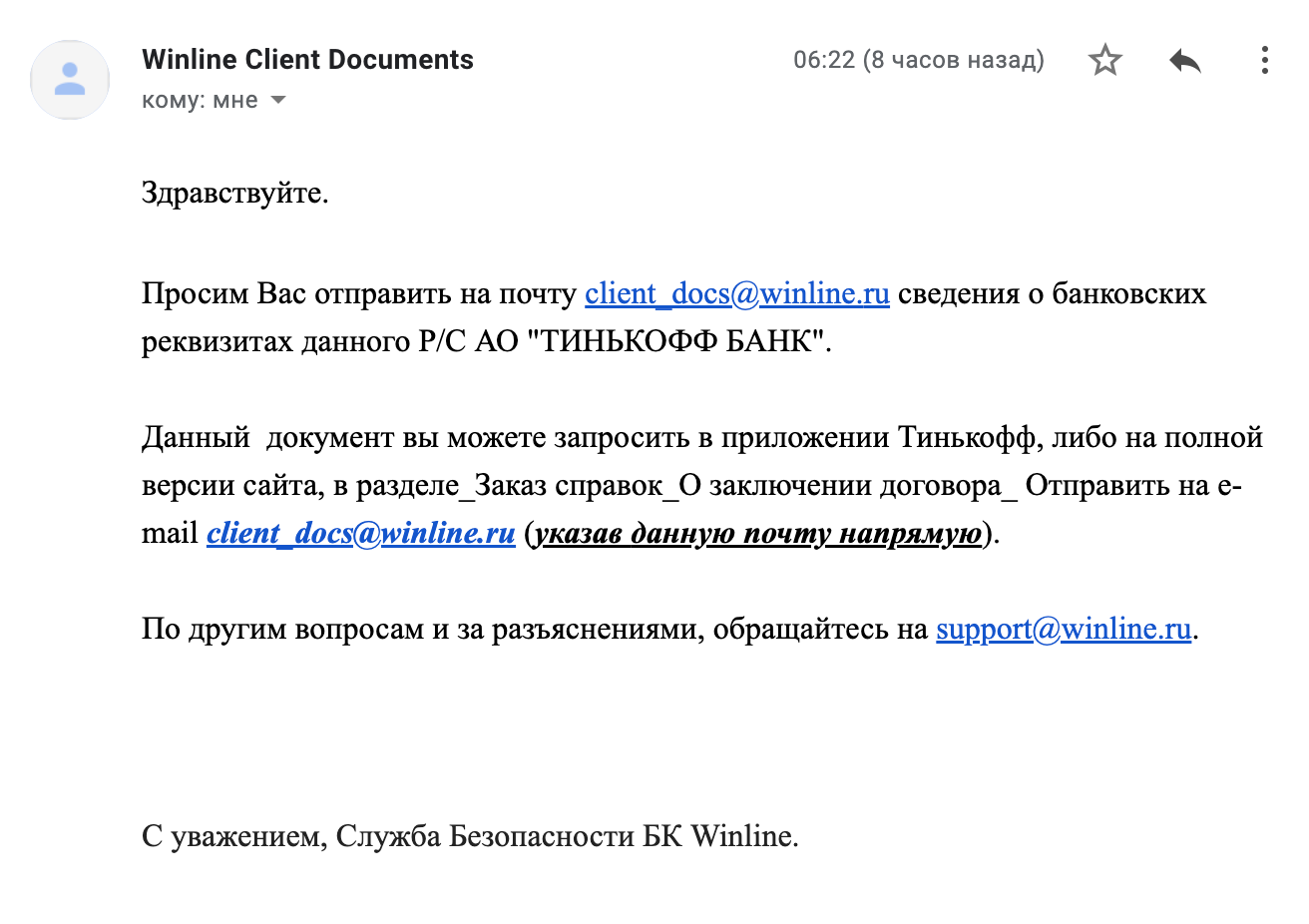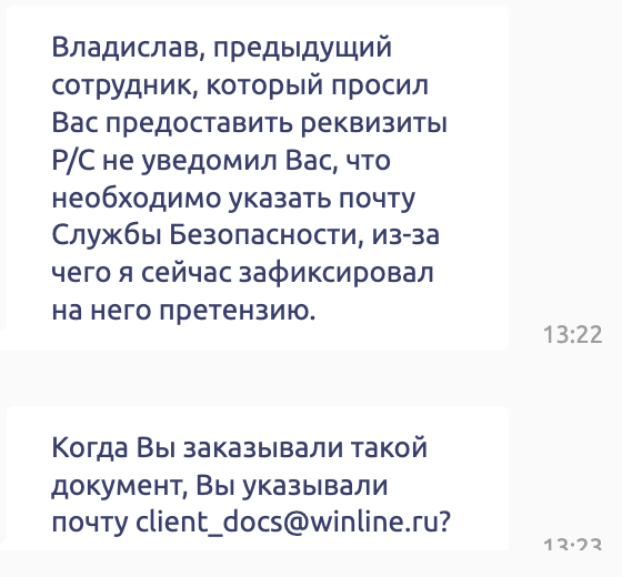 Приветствую! 6 марта мне ограничили вывод средств, оставив единственный способ вывода только на банковский счет. Поддержка ответила, что заявку рассмотрят в течении 10 дней, а вывод средств, так и оставался на рассмотрении. 15 марта мне отменили все мои заявки на вывод средств, и если бы я не обратился в чат, так и не узнал, что препятствующей причиной тому была, необходимость в справке о владении моего банковского счета, которую я должен САМ отправить на почту, и сказали ожидать проверки в течении 12 часов. 16 марта мне деньги так и не поступили на счет, и я снова обратился в поддержку, на что мне ответили, что это БАНК должен отправить справку о владении моего банковского счета, а не я САМ! Банк пошел мне на встречу и отправил справку на почту, как и просили меня в поддержке Winline, НО на мой вопрос получили ли они справку, во избежании препятствующих причин, в этот раз мне ответили, что документы УЖЕ рассматриваются в течении 5 дней!!! Вместо 12 часов, уже стало 5 дней! То я должен САМ отправить справку, а теперь БАНК! Происходит переобувание в воздухе, либо в службе поддержке работают некомпетентные люди, только и делают, что тянут время, тратят мое и свое драгоценное время в конце концов. Прошу Вас помочь разрешить данный вопрос. Считаю ограничение на вывод средств безосновательной.