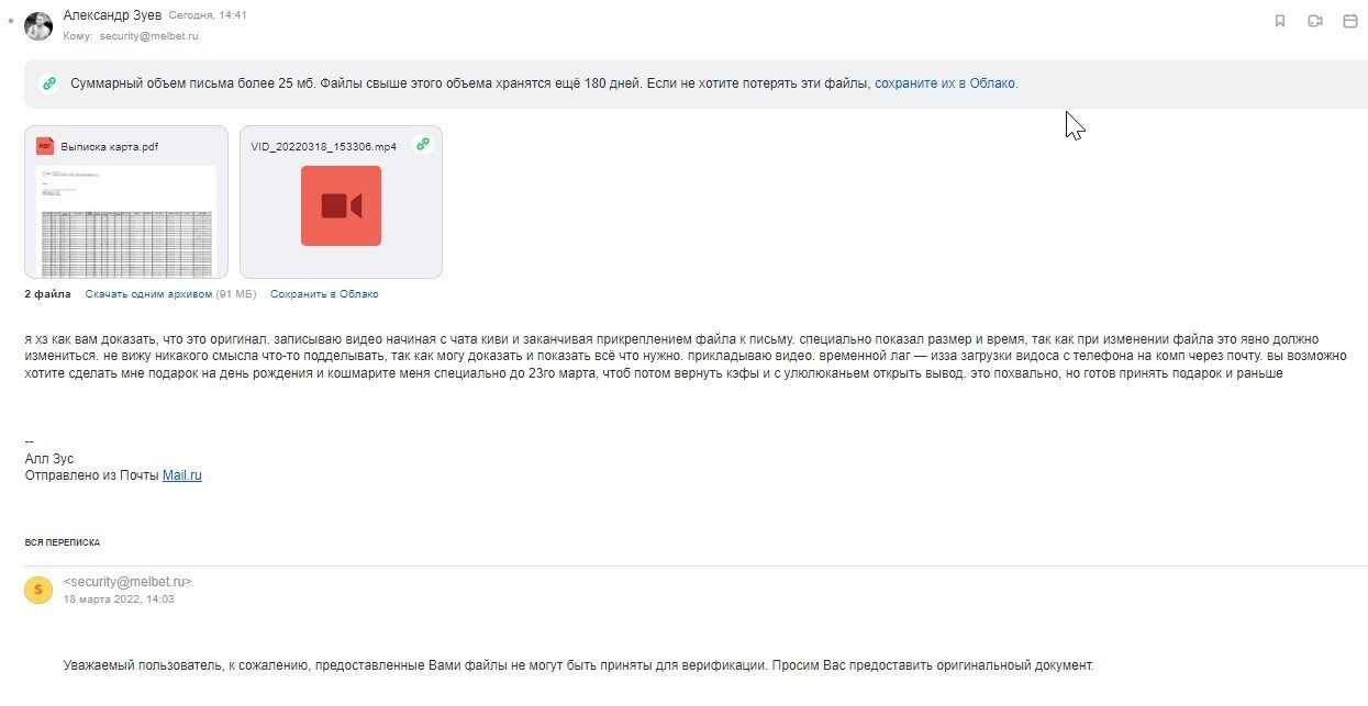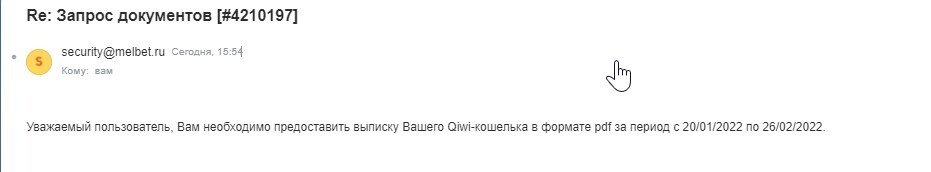 Думаю ситуация похожа на остальные. Работал с ними пару месяцев. Бонусы не отыгрывал, так как там максимально идиотские условия, аккаунт первый раз. Много слышал, что это помойка, но так как я опытный игрок и у меня все норм с документами и я могу пройти любой вериф - решил залезть. К тому же у них, что не говори, лучшие кф на рынке. Несколько недель я их мучал. Ушел в хороший плюс. Ну и случилась порезка и проверка документов. И такой дичи я не встречал нигде. Во первых - они просят один документ строго раз в три дня. Будь то паспорт или скриншот. Им все равно. Регламент позволяет растягивать верификацию на долго. Во вторых - помимо банальных фоток паспорта - спрашивают договор на симкарту. И тут кроется ловушка - дубликаты договоров сейчас не выдают. МОжете позвонить на горячую линию или в салон мтс - они их просто не выдают. На этом месте озорной попан попадает в лошушку из которой уже не выбраться - так как на горячей линиии мелбет они по скриптам посылают тебя на **** - мол хочешь денег - иди ищи договор. И ладно если ты, как мультиаккаунтер хранишь договора под подушкой, но у меня этот номер с 2017 года (как оказалось) - естественно никаких договоров на руках у меня нету и мне пришлось подключать связи, чтобы раздобыть официально эту сраную справку. Но сегодня они превзошли сами себя. Попросили выписку с киви карты, которой я пополнял (специально для БК у меня есть виртуальная карта) и попросили, чтоб на выписке было пополнение их БК. Не вопрос - я посмотрел когда было последнее пополнение и попросил выписку за этот день. На киви напутали и скинули лишнего, но не суть. Я скачал файл и отправил им на почту. Далее они попросили выписку за два месяца. Ок. Я сбросил. Ну а далее началось то, чего я не мог ожидать и то от чего честно говоря у меня взорвалась *****. Они прислали мне вот такой ответ: "Уважаемый пользователь, к сожалению, предоставленные Вами файлы не могут быть приняты для верификации. Просим Вас предоставить оригинальноый документ. В случае повторного предоставления чужих, недействительных, поддельных документов (в том числе измененных при помощи различных программ и графических редакторов), Ваш счет будет заблокирован." И бог с ним, что там сидят безграмотные люди и даже в скрипте у них ошибка (слово оригинальный пишется не так) Но ****** обвинять меня в подделке - это верх наглости. На вопрос - а что не так то - пишут скиньте оригинал. А тот файл, что вы скинули - не оригинал. И вот хоть стой хоть падай. При чем я специально записал видео, где я скачиваю файл из чата киви и прикрепляю его в их письмо. Приложил это видео к файлу. Бесполезно. Несколько раз просил перейти сразу к видеоконфе - но это явно не в их интересах, так как придется выплачивать выигрыш. Помогите разрулить эту дичь.