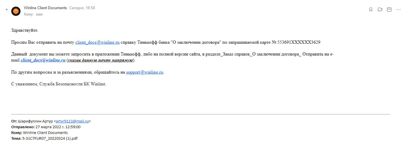 Здравствуйте. Вам нужно предоставить справку из банка "о заключении договора" на карту *3629. Можно запросить справку онлайн, отправив ее напрямую на почту конторы client_docs@winline.ru.