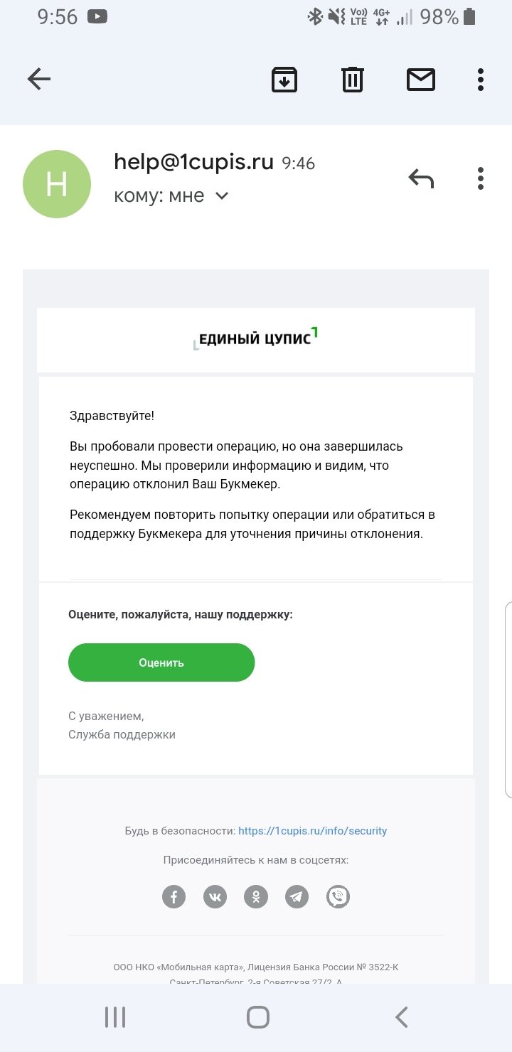Поддержка winline меня игнорирует, три дня назад я уже писал им на почту, ответа так и не поступило, вчера я отправил им писмо с бумажным договором ответа так же нет, ужасная поддержка, другие бк отвечают в тот же день, а тут просто игнор.