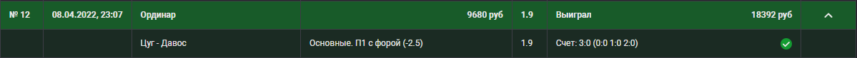 Цуг - Давос: Основные. П1 с форой (-2.5)". Ставка выиграла.