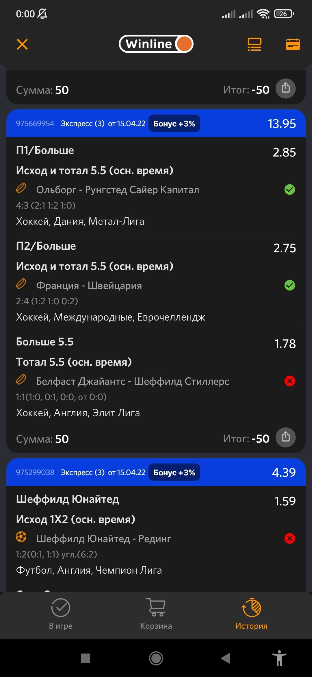 Рассчитали хоккейный матч неверно,тотал хоккейного матча поставил больше 5.5 ,забросили восемь шайб в основное,а в приложении счёт вообще 1:1 в основное время в итоге в билете матч оказался проигранным
