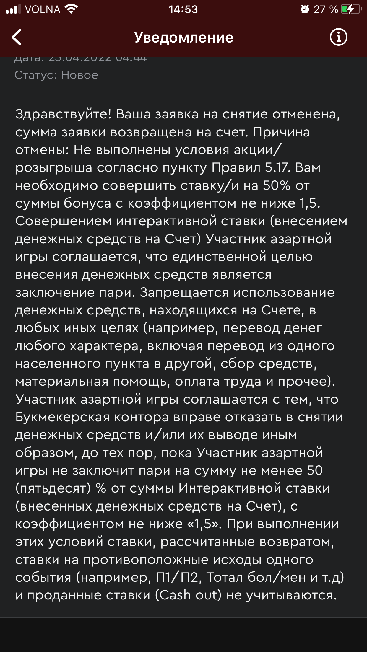 Зарегестрировался в конторе Олимпбет, внёс депозит 392 рубля, сыграл ими, получил бонус 5000р, поставил их, событие выиграло, получил 5000 на счёт в рублях. Затем пытался их вывести, мне отклонили заявку в соответствии с тем что данную сумму необходимо пустить в оборот. Сделал две ставки номиналом 4000 и 1000 рублей, они выиграли, поставил на вывод 8820 выигранных рублей. После этого деньги зависли в обработке на три дня, неоднократно связывался всеми предложенными способами с поддержкой, где мне отвечали что я могу вывести эти деньги и это займёт около 48 часов после рассчета пари. Сегодня опять звонил в поддержку так как прошло указанное время, но деньги не пришли, мне ответили что все придёт, но в связи с большим количеством транзакций это займёт ещё около 3-5 дней. После этого спустя пару часов мне опять отклоняют заявку на вывод несмотря на все выполненные условия и полностью идентифицированный аккаунт. Прошу разобраться в этой ситуации, уверен что я не один, кого с этой акцией контора просто водит за нос и не хочет отдавать деньги