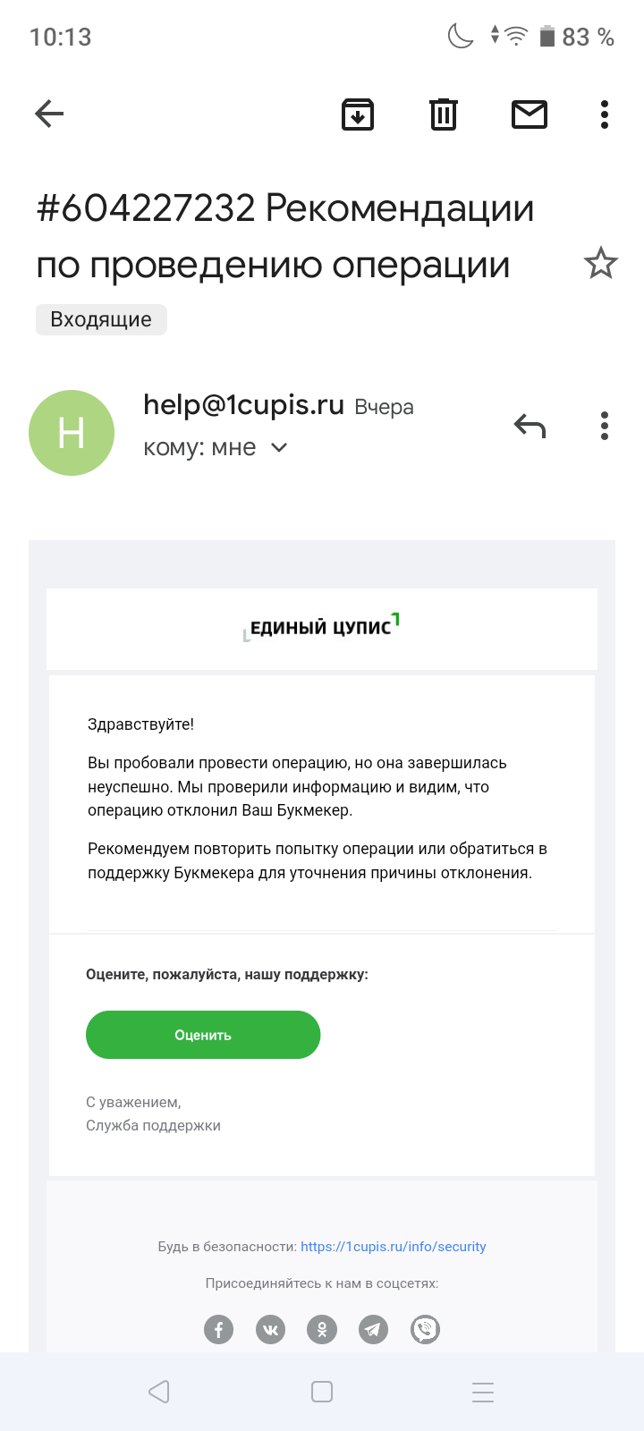 Здравствуйте. Ставила на вывод 9 апреля, 18 апреля пришли отказы по операции. За это время ничего от букмекера не поступало, они ничего не запрашивали, просто закрыли выводы и они пропали из истории. На телефон не отвечают, линия всегда занята, по почте тоже ответа нет. И вывести можно только на цупис, туда и ставила на вывод. Вижу, что это частая проблема...