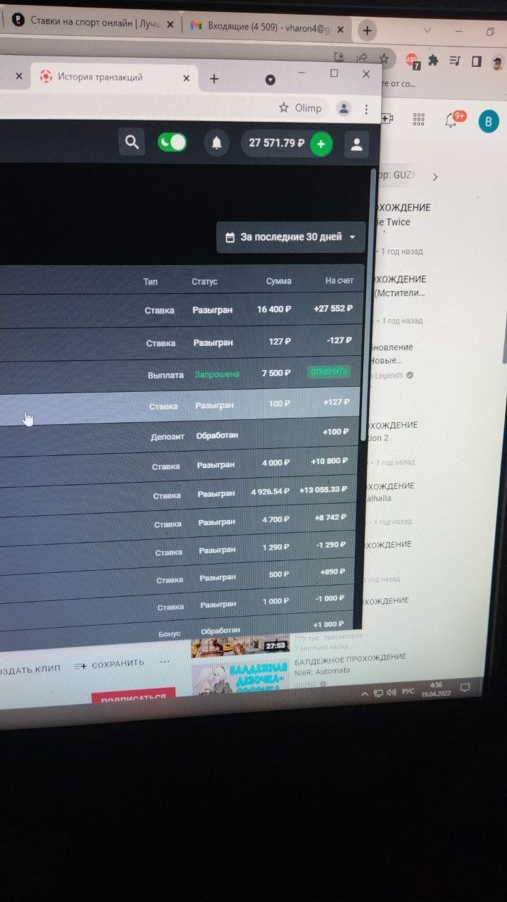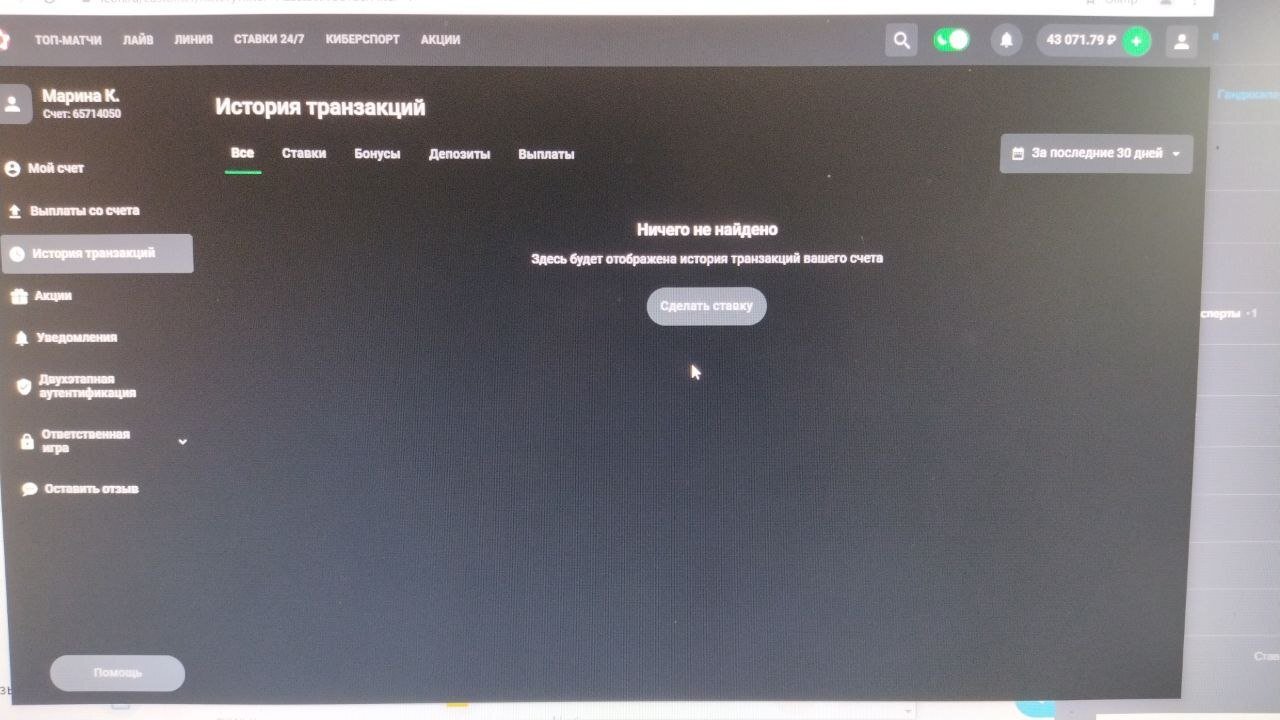 Здравствуйте, повелась на их рекламу, что дают 5к фрибетов. Я их отыграла и разогнала там свой банк до 43к, но при выводе меня ждала не приятная ситуация, накинули верификацию. Но это ладно, они подчистили всю историю транзакций, благо я сделала скрины. Поинтересуйтесь у них по этому вопросу, почему они удалили все ставки.