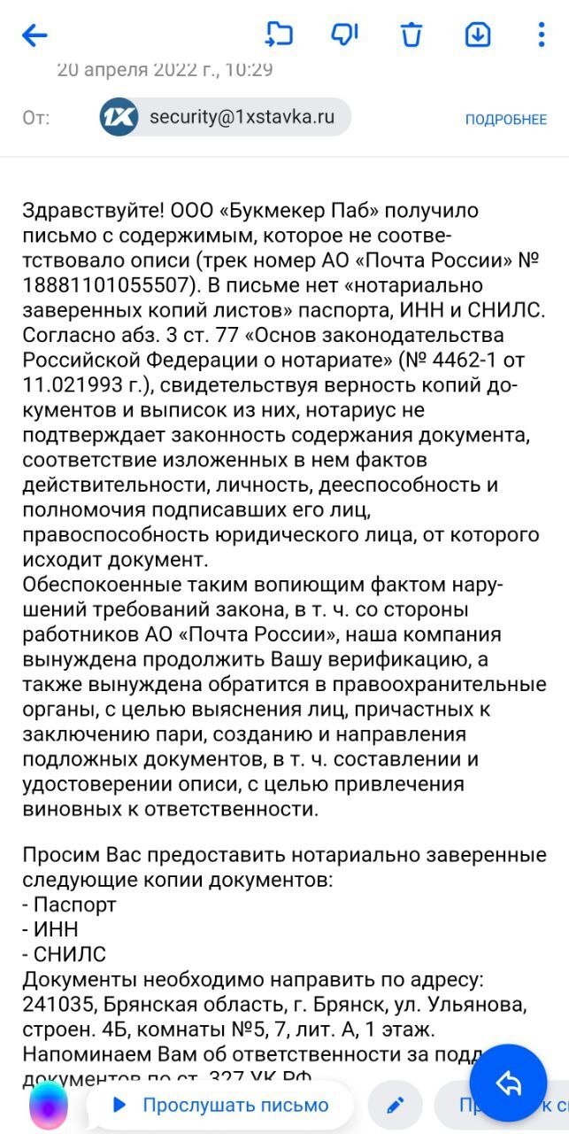 Эпопея с выводом денег со счета длится с ! С на адрес мною уже было прислано: - фото паспорта (более 10 вариантов); - договор с сотовым оператором (5 вариантов); - выписку с кошелька (изначальный запрос дополнялся 3 раза и все это с ожиданием 3 суток); - селфи с паспортом на фоне переписки (3 варианта); - запрос на фото оплаченных квитанций за КУ изменился на запрос фото самой пришедшей квитанции; - фото ИНН; - фото СНИЛС; - фото меня с листом бумаги, на которое нанес текущую дату и индивидуальный код; - запрашивали еще водительские права, загранпаспорт и свидетельство о рождении! После моего ответа, что прав, заграна и свидетельства о рождении у меня нет, запросили "нотариально заверенные следующие копии документов: - Паспорт - ИНН - СНИЛС" Предоставил, предварительно составив опись вложения, тк знал, что 1хставка может ответить, что ничего не получали. Оказалось всё еще хитрее!!! Теперь они утверждают, что опись вложения не соответствует самому вложению и, по их словам, будут обращаться в правоохранительные органы! Цитирую ответ: "В письме нет «нотариально заверенных копий листов» паспорта, ИНН и СНИЛС. Согласно абз. 3 ст. 77 «Основ законодательства Российской Федерации о нотариате» (№ 4462-1 от г.), свидетельствуя верность копий документов и выписок из них, нотариус не подтверждает законность содержания документа, соответствие изложенных в нем фактов действительности, личность, дееспособность и полномочия подписавших его лиц, правоспособность юридического лица, от которого исходит документ."По факту все эти документы в письме были, подтвердить, что мною эти документы были сделаны, может нотариус, то, что запрошенные документы в письме находились, может сотрудник почты! Что я могу изменить? Если я отправлю еще одно письмо даже без описи вложения, то они скажут, что вообще ничего не получали!!! Это беспредел!!! Помогите хотя бы понять, что им вообще от меня надо!Прошу помочь вывести деньги. На данный момент на моем счете БК 1хставка находится сумма 99279р. Также подсчитано, что мною внесена сумма 71500р и полностью разыграна. После получения выигрыша смог вывести только 15000р.