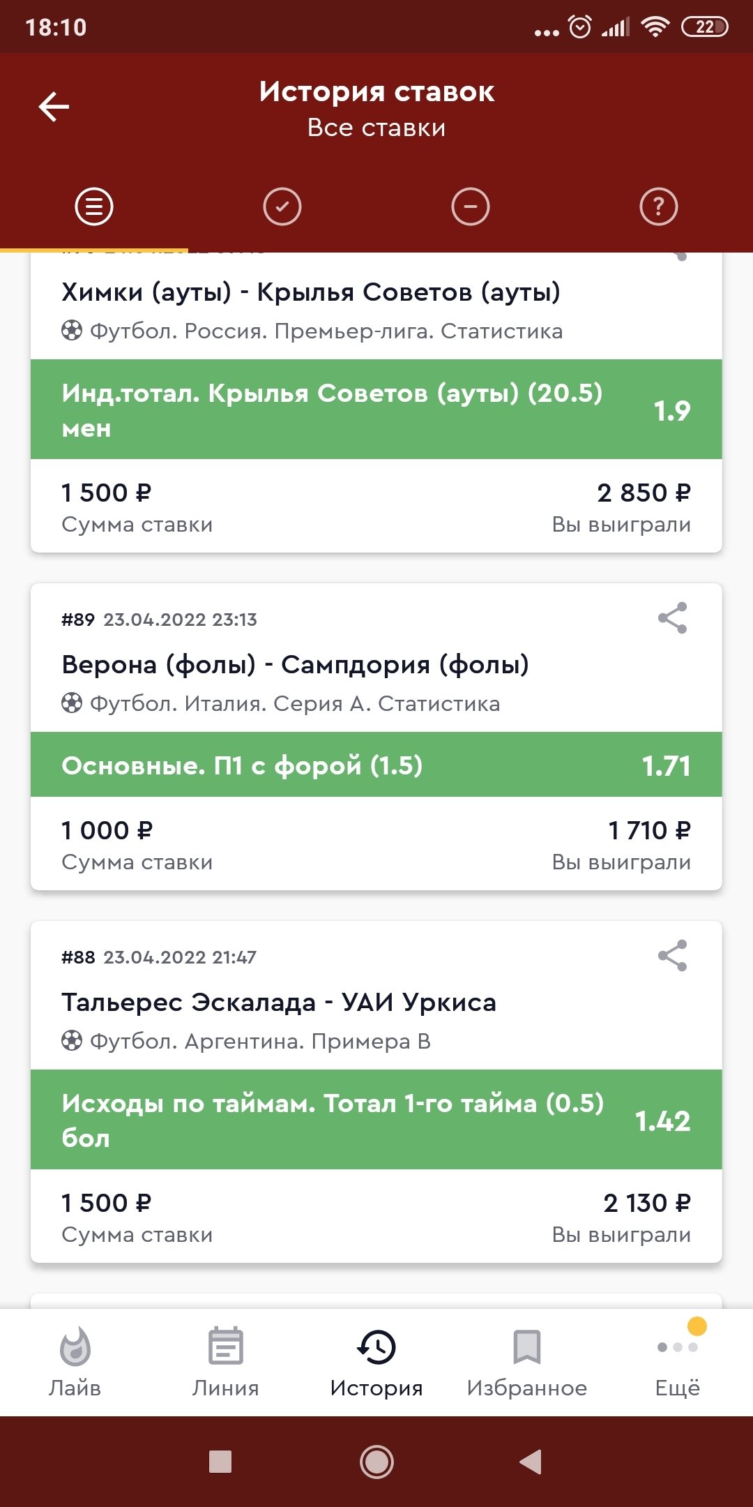 Результаты на момент ставки: 0:0@ 22" - ставка рассчитана выигрышем, коэффициент ставки был перерасчитан с 2.75 на 1.8 согласно пункту правил 9.13. а) коэффициент выигрыша одновременно создает арбитражную ситуацию с другими коэффициентами выигрыша, предлагаемыми как Букмекерской конторой, так и другими