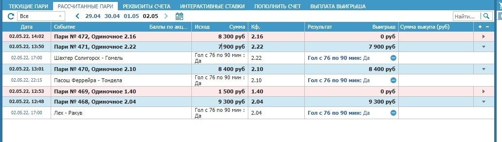 рассчитали 7 ставок возвратом. те которые выиграли. причем проблемы начались еще 2 мая, когда не подходил логин и пароль на целые сутки и они также рассчитали ставку возвратом от 30 апреля даже. т.е. тупо последние выигравшие ставки, а которые проиграли так и остались проигранные. так что технически они обнулили баланс путем перерасчета ставок а по факту просто украли выигрыш.
