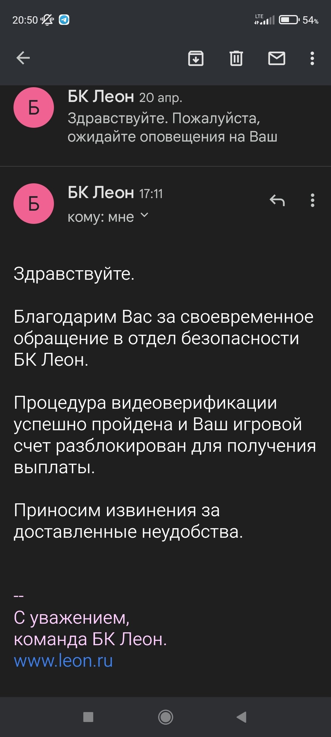 11 апреля мой счёт заблокировали .сегодня я прошел видеоверефикацию успешно .поставил на вывод но деньги так и висят в обработке и не проходят .на сообщения Леон перестал отвечать после сообщения о успешной верефикации ID транзакции 91672000