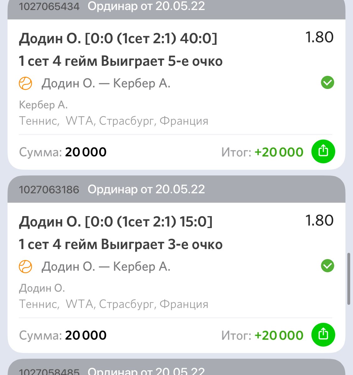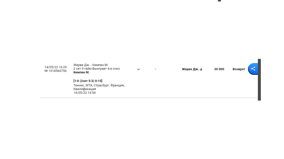 Данная ситуация повторяется вновь. Была сделана ставка на победу в розыгрыше в Лайве в теннисе, и вновь ставка сыграла, но пришёл возврат