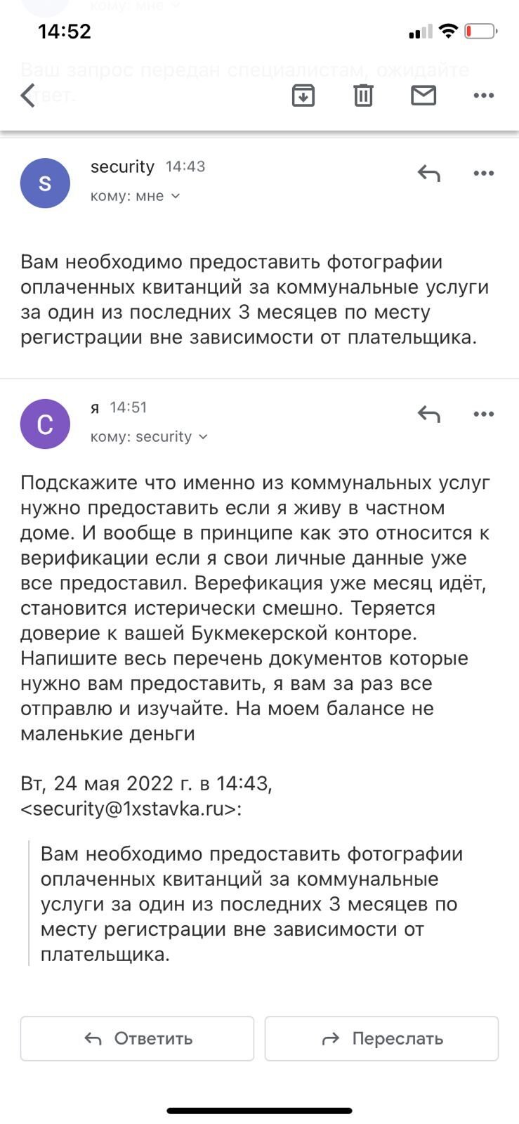 С Мошенническая контора 1хСтавка не выводит денежные средства с игрового счета под предлогом дополнительной верификации. Запрашивали фото: паспорта под разными углами на разном фоне, паспорт на просвет, прописку, договор с мобильным оператором, карту, выписку с киви, фото лицо и паспорт на фоне переписки со службой безопасности. Теперь ещё запросили фото квитанции за коммунальные услуги по адресу регистрации независимо от плательщика. Что за бред? Какое это имеет отношение к верификации личности? Судя по жалобам на данную букмекерскую контору это ещё не все их бредни. На счету чуть больше 58000р, деньги не маленькие. Прошу помочь разобраться с данным вопросом и повлиять на букмекерскую контору. Если можно ещё повесить при входе на сайт 1хСтавка плашку "SCAM".