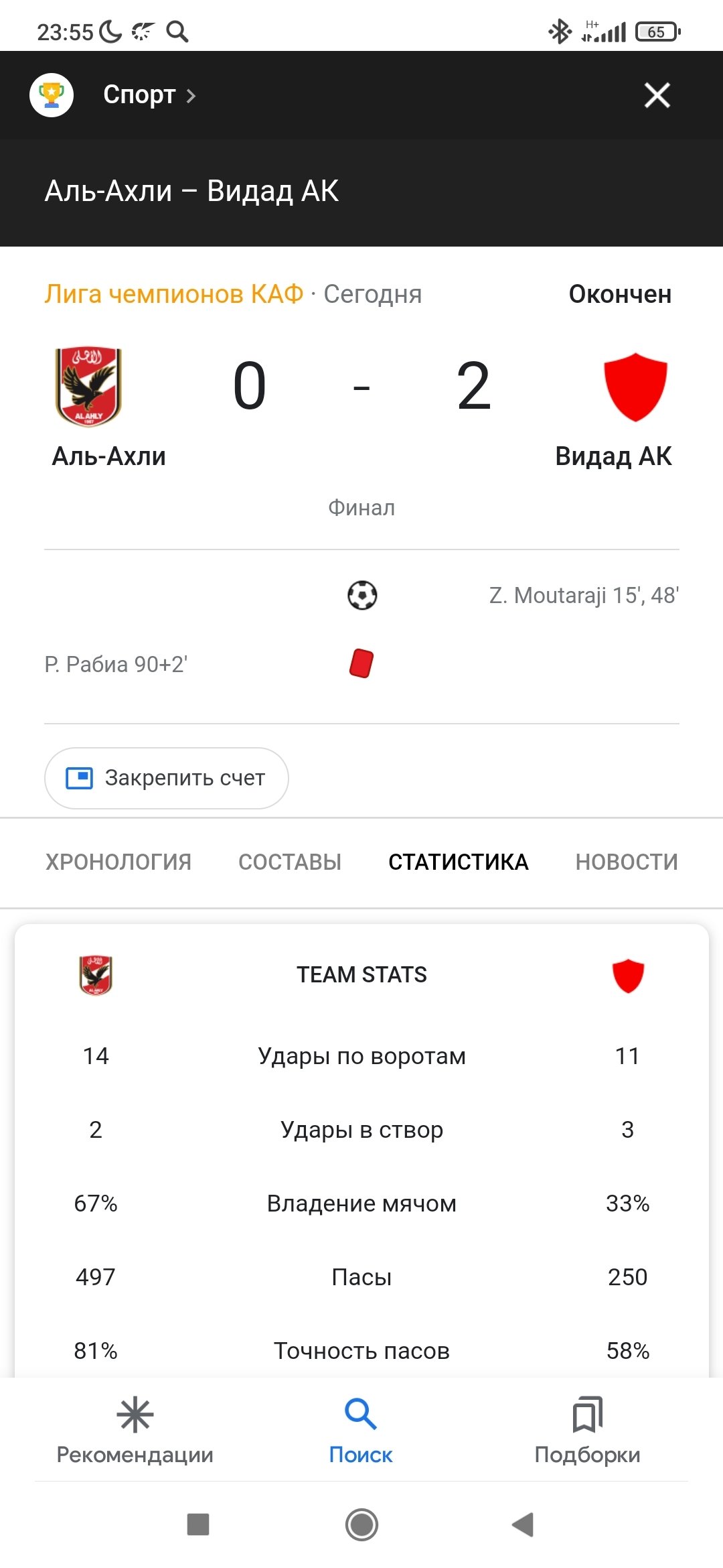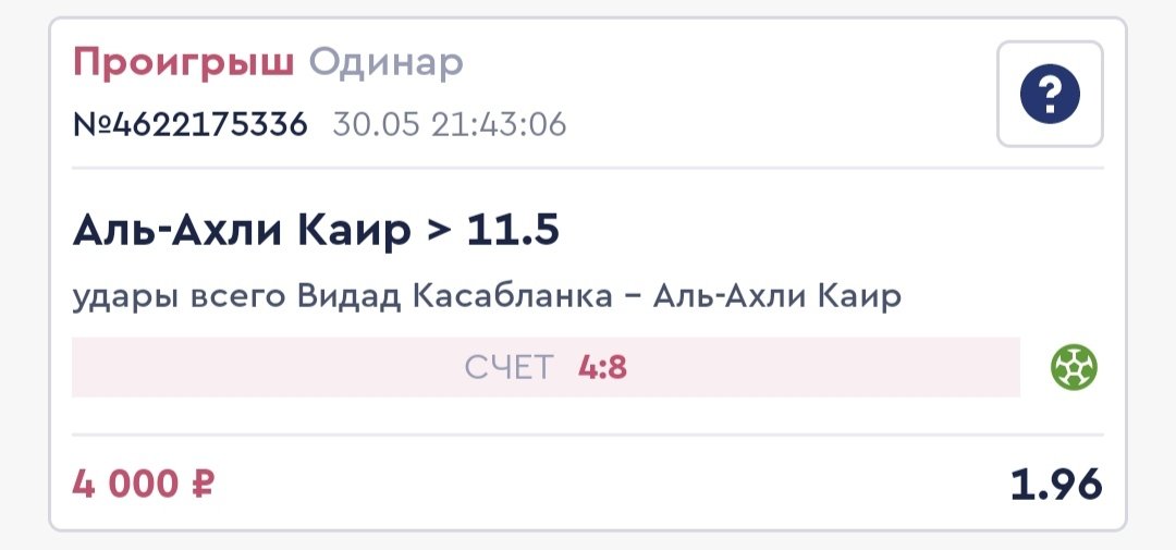 Ставка на финал Лиги чемпионов (Африка) Аль-Ахли - Видад заключил пари на то что Аль-Ахли производит 11,5 больше ударов в сторону ворот и он сделал 14 ударов но Фонбет решил что счет ударов 8-4 и мое пари проигран! в реале 14-11))