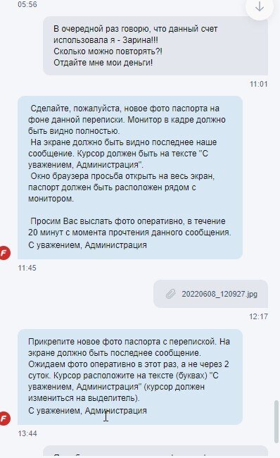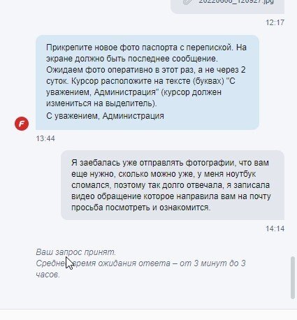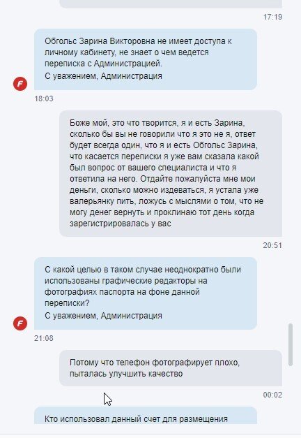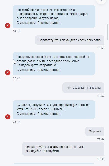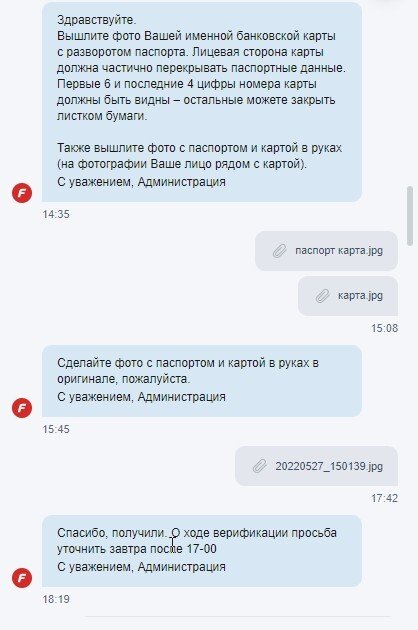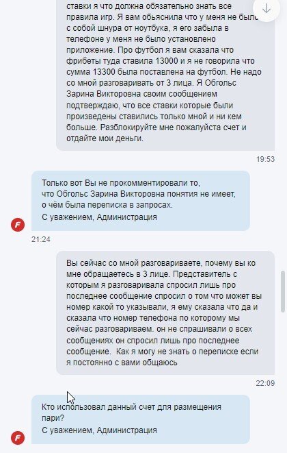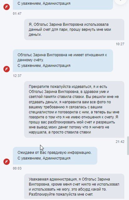 Здравствуйте, ставила ставки на теннис, после чего меня заблокировали, я написала оператору для уточнения, меня перенаправили в запросы. Создала запрос, там меня попросили предоставить фото, я предоставила, после попросили еще раз 5 фото предоставить, я предоставила, далее они сказали что необходимо пройти проверку через видео, я прошла проверку и ту они опять повторно начинают запрашивать фотографии точно такие же как и раньше, у меня вопрос Это что вообще происходит??? Ну сколько можно я с 19 мая предоставляю все что они требуют я прошла видео, я устала уже, отдайте в конце концов мне мои деньги, сегодня я записала дополнительное видеообращение которое направила им на почту, так они просто ответили СОЗДАЙТЕ ЗАПРОС, вам вообще не стыдно??? Далее приложу всю переписку. А всем кто читает мою жалобу не вздумайте регестрироватся в этой конторе, потому что тут дурят людей и не хотят отдавать деньги.