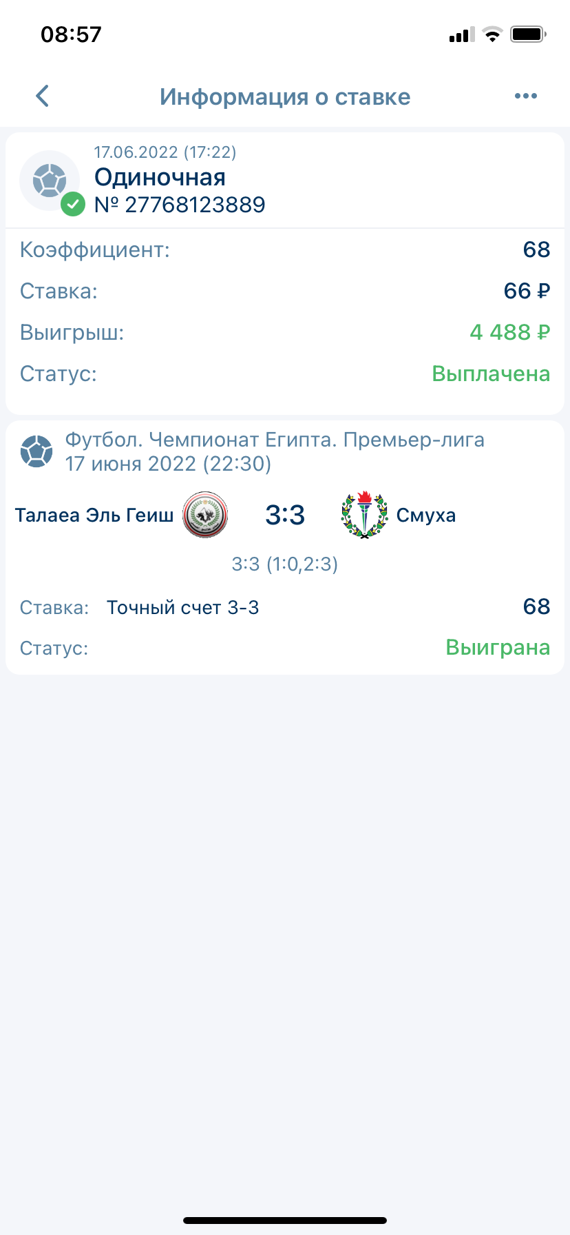 Добрый день! до начала матча поставил на точный счёт 3:3 команд: Тала Аль-Гаиш - Смоуха кф 100. Команды сыграли с вышеуказанным счетом. Выплату бк винлайн на данный момент не производит, ссылаясь что выплаты происходят до 90 суток. Со своей стороны я не могу получить выплату вовремя, просьба помочь в сложившейся ситуации. Так как со своей стороны я ничего не нарушил, а бк пытается меня обмануть, удерживая мои денежные средства, не исполняет обязательства по выплате выигранных мною денег. Просьба рассчитать ставку.