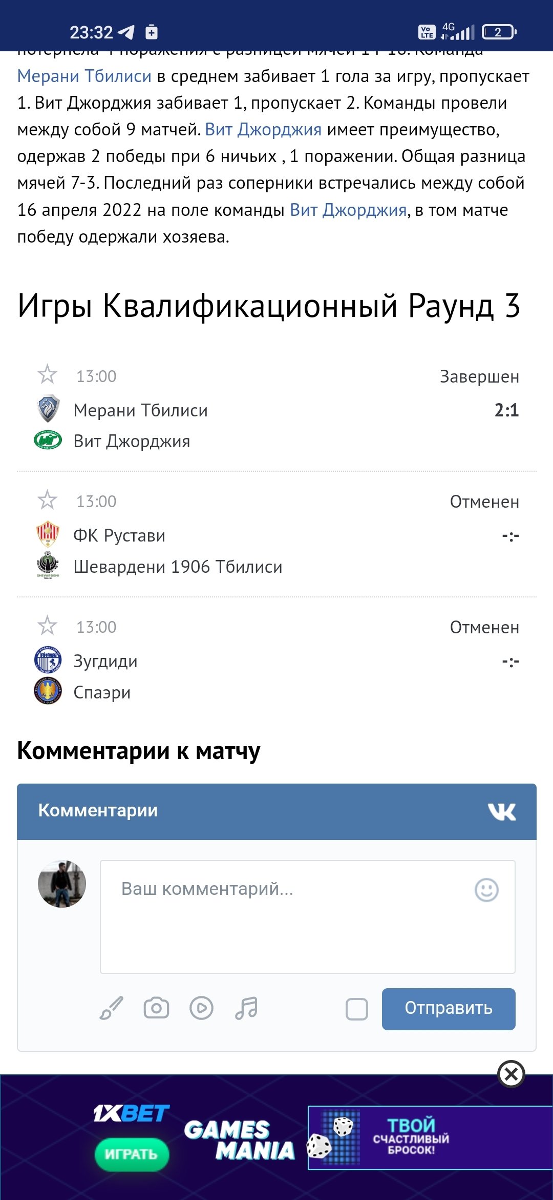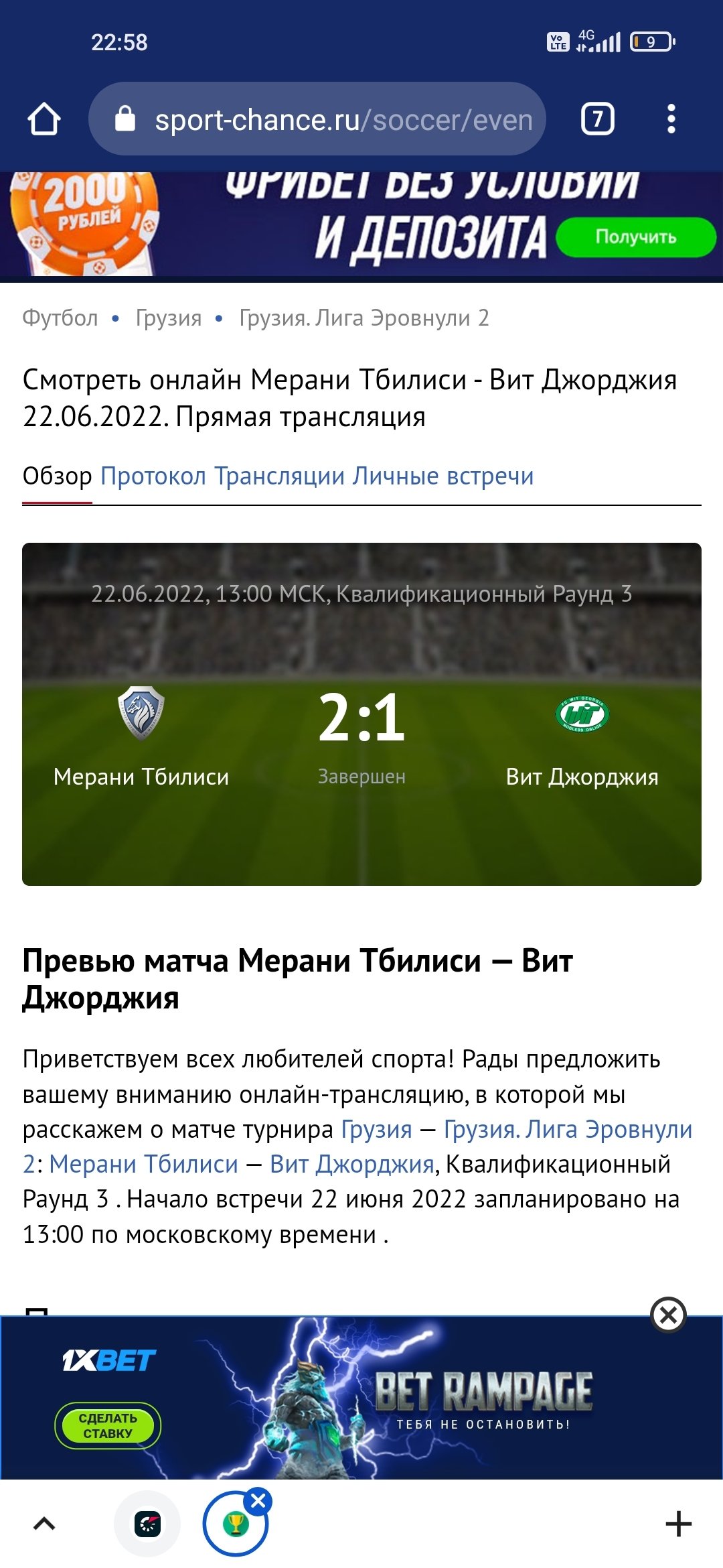 На официальном сайте грузинской федерации счет матча указан 2:2. https://www.gff.ge/en/championships/regional-league/group-east В списке это самый нижний матч за 22 число.