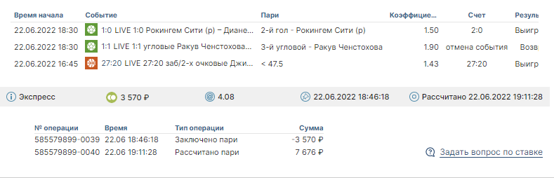 Приветствую. Во время товарищеской встречи по футболу между Ракув Ченстохова и Лехия Гданьск на 30 минуте был объявлен перерыв(обычное дело в товарищеских матчах) спустя время матч возобновили и доиграли до конца, однако БК Пари оформил возврат по причине "отсутствия официальных результатов", но это не так имеется видеотрансляция встречи, которую БК предоставила напротив пари, так же данный матч рассчитан в других БК, что говорит о наличие официальных данных которые обладают букмекеры и наверняка ПАРИ. Вот ссылка на игру p.s 3-й угловой был исполнен на 32:10 минуте