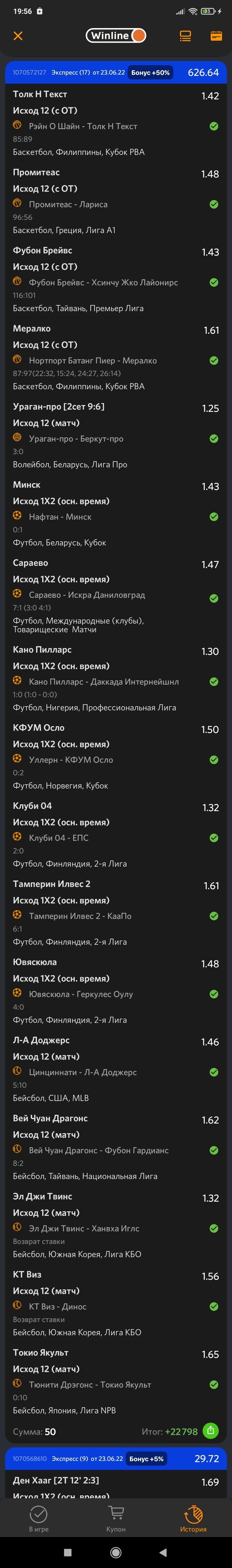 У вас один бейсбольный матч возвратом рассчитан. На что именно вы там ставили? Выложите нормальный скрин с ПОЛНОЙ версии сайта.