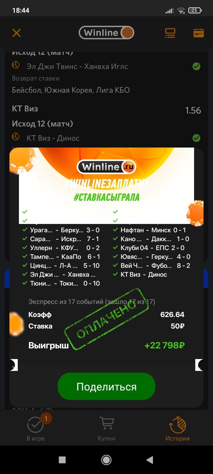 Сейчас вернули правильный счёт только денег на половину меньше. КФ 626,65 ставка 50 плюс бонус экспресс 50 должно быть больше 46000, а выставили 22798 и то не знаю когда на счёт придут