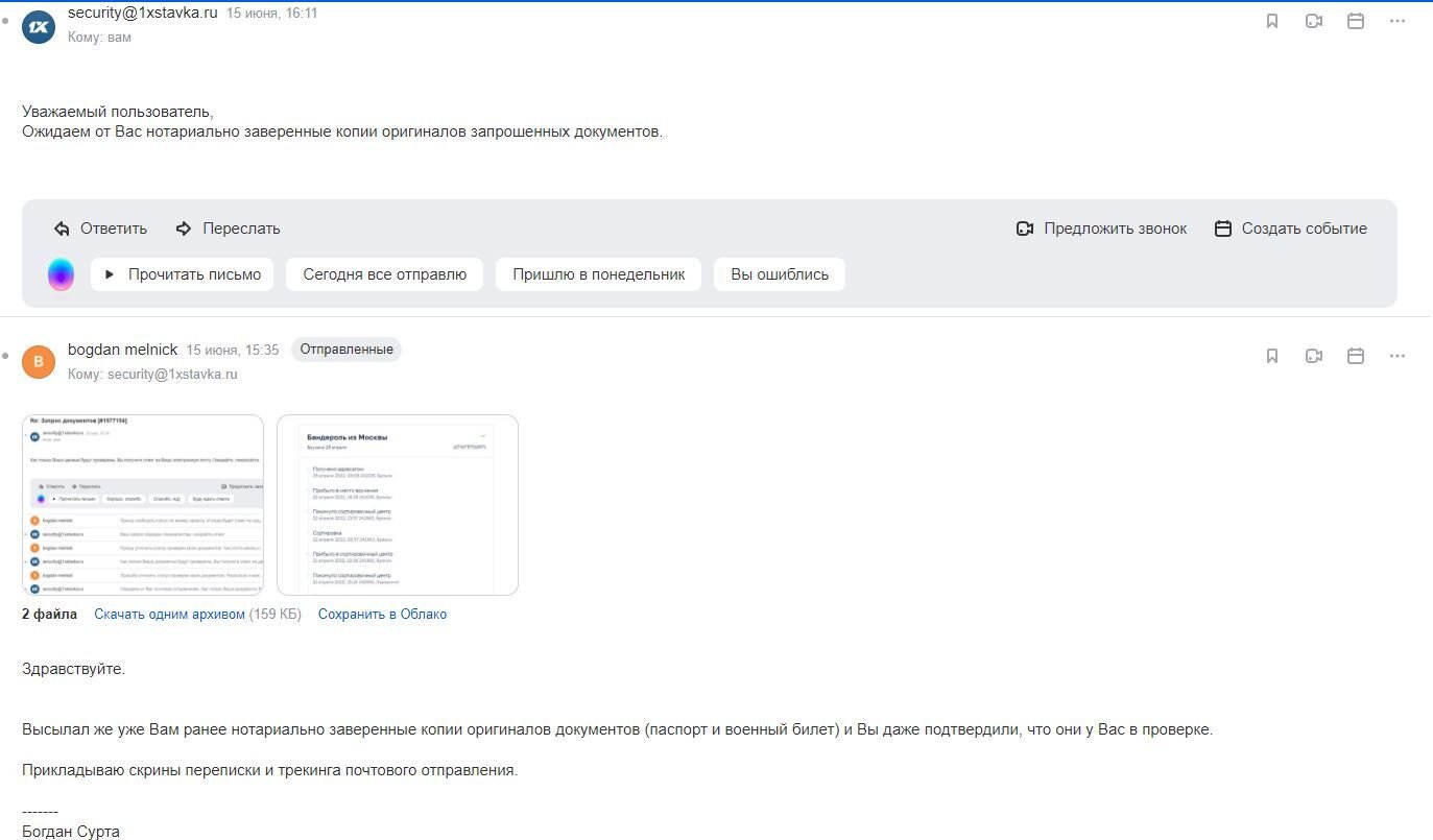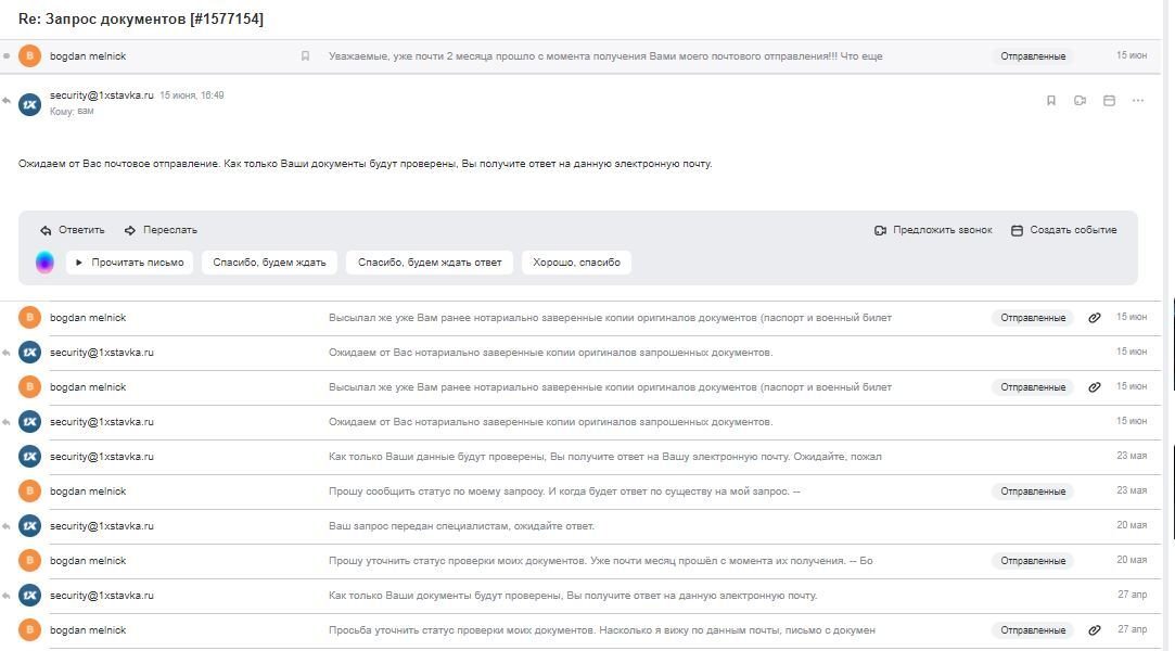 Здравствуйте. С июня 2021 года я играл в 1хставка. Выиграл значимую для себя сумму, решил вывести - отказ, отправили на верификацию. Длительная переписка с БК (с предоставлением кучи документов) закончилась требованием отправить нотариально заверенные копии документов (паспорта и военного билета). Отправил в БК нотариально заверенные документы заказным письмом, письмо БК получили . Далее, сперва на мои вопросы в переписку (подскажите статус проверки полученных документов) получал одни отписки; а теперь БК делает вид, что они ничего не получали и требует снова отправить документы. Скрины переписки прикладываю. Прошу Вас помочь в данной ситуации, т.к. все запрошенные БК документы для верификации мной предоставлены.