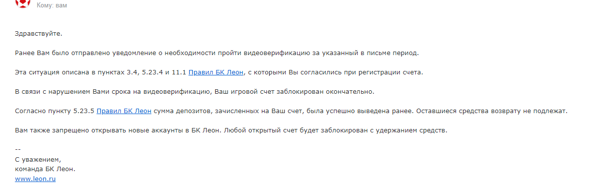 Здравствуйте.Зарегался в бк Леон. Ставил ставки на теннисе. Вывел. 18 вечером при попытке вывода прошел стандартную верификацию,затем попробовал поставить на вывод,написали вы проходите стандартную верификацию для вывода, на следующий день позвонили с леона позадавали вопросы,на все вопросы получили ответы и сказали,что процесс верификации на финальной стадии